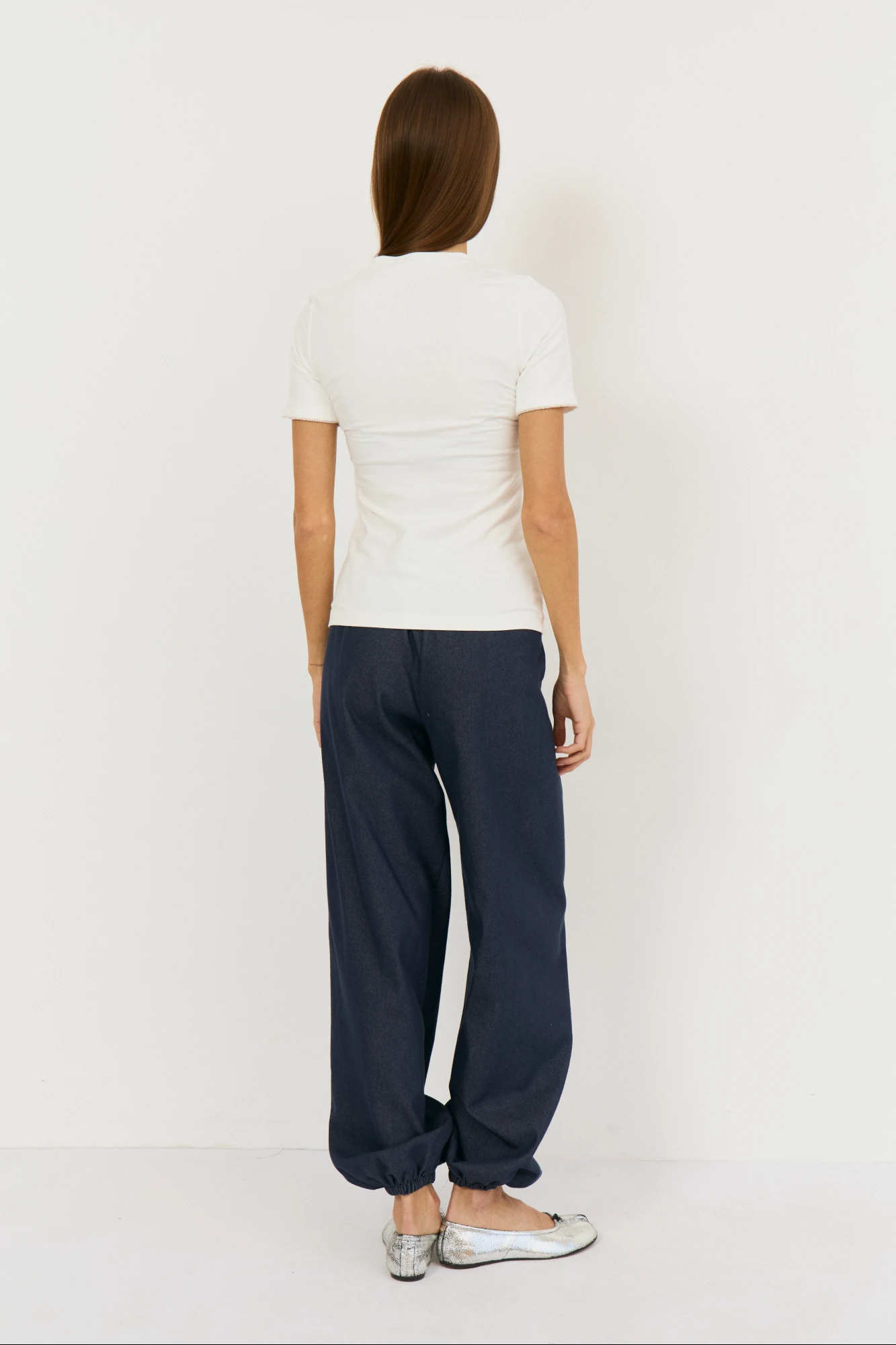 Базовая футболка, выполнена из хлопковой ткани (кулирка) , прилегающего силуэта с декоративной тесьмой со стразами по линии рукава .Рукава втачные. Вырез горловины круглый, обработан бейкой. Полуобхват груди -39 см, длина рукава - 21 см, Длина по спинке 59 см.