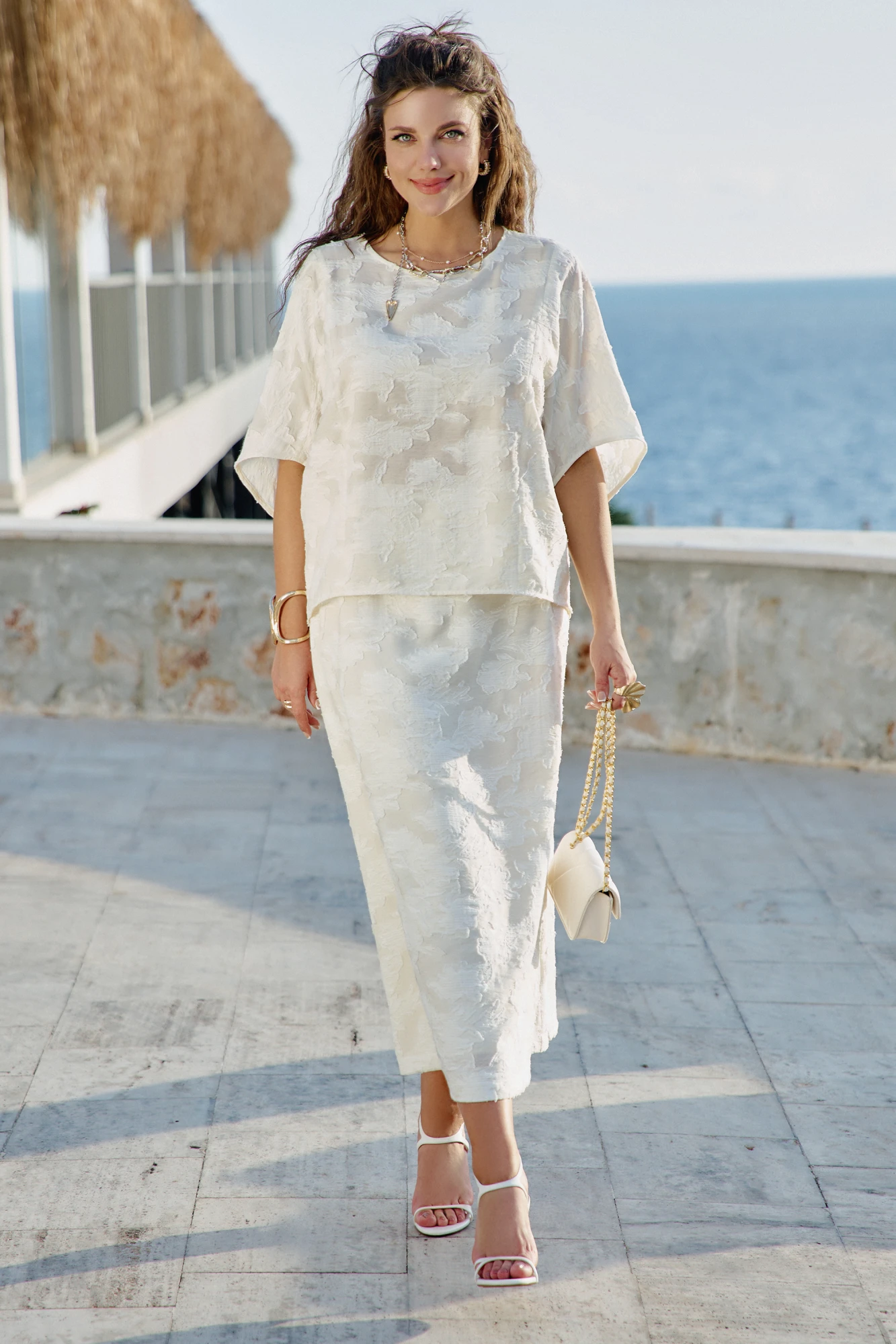 Юбка А-силуэта молочного оттенка с фактурным принтом — это выбор женщины, которая: ценит элегантность в движении — а не статичную красоту, любит тактильные ощущения — наслаждается прикосновением ткани, предпочитает мягкую женственность — без агрессивных линий, обладает вкусом к деталям — замечает красоту в текстурах, не боится быть заметной — но делает это изящно. В мире, где часто приходится выбирать между комфортом и стилем, эта юбка предлагает и то, и другое — свободу движения и утончённость линий, практичность кроя и художественность фактуры. Это не просто предмет гардероба — это заявление о подходе к жизни: можно быть одновременно и сильной, и нежной, и современной, и романтичной, и простой, и сложной. Юбка длины миди — это воплощение элегантной непринужденности. Она опускается ровно до середины икры, открывая изящные щиколотки. Юбка расклешенная, длины миди с притачным поясом со вставкой эластичной тесьмы-резинки в бочках. По спинке юбки застёжка на потайную молнию и пуговицу в поясе. Юбка на подкладке. Длина юбки 84 см.