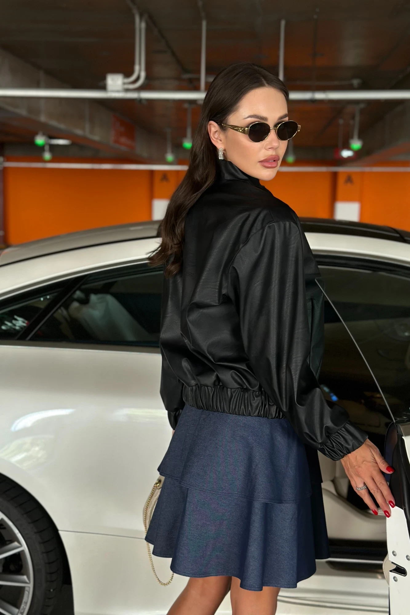 Бомбер выполнен из синтетической кожи, на подкладке. Низ изделия и низ рукавов обработан широкой резинкой. Рукав втачной, прямой, одношовный, плечевой шов спущен. Воротник обработан невысокой стойкой из основной ткани. Застёжка - пуговицы.