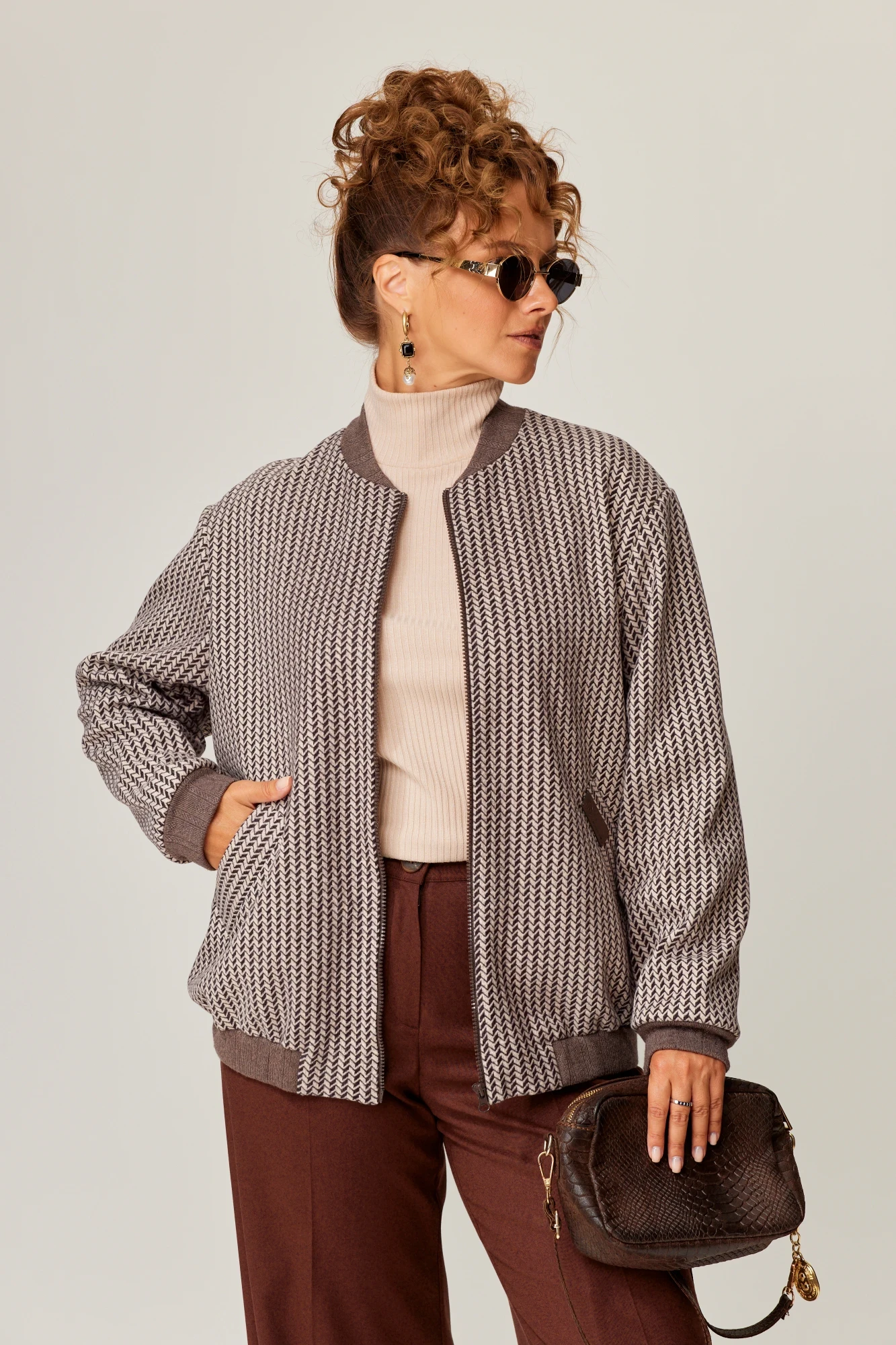 Бомбер выполнен из плотной костюмной ткани. Бомбер с застежкой на молнию. Горловина округлой формы обработана довязом. В передней части прорезные карманы с листочкой с наклонным входом. На правой листочке расположена нашивка. Рукав втачной одношовный с манжетой - довязом понизу. Бомбер на подкладке. Длина бомбера - 69 см, длина рукава бомбера - 57 см.