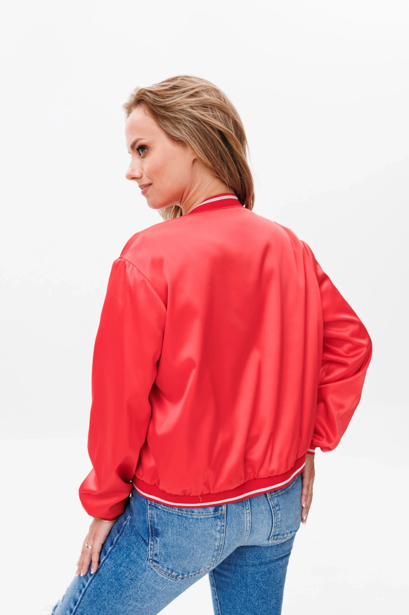 Бомбер прямого силуэта со слегка спущенным плечом из атласной ткани средней плотности, собран на довяз понизу. Перед с рельефами и карманами на молнии. Застежка на молнию по переду. Горловина обработана довязом. Рукав втачной одношовный, собран по низу на довяз. Жакет на подкладке. Длина бомбера - 58 см, длина рукава - 57 см.