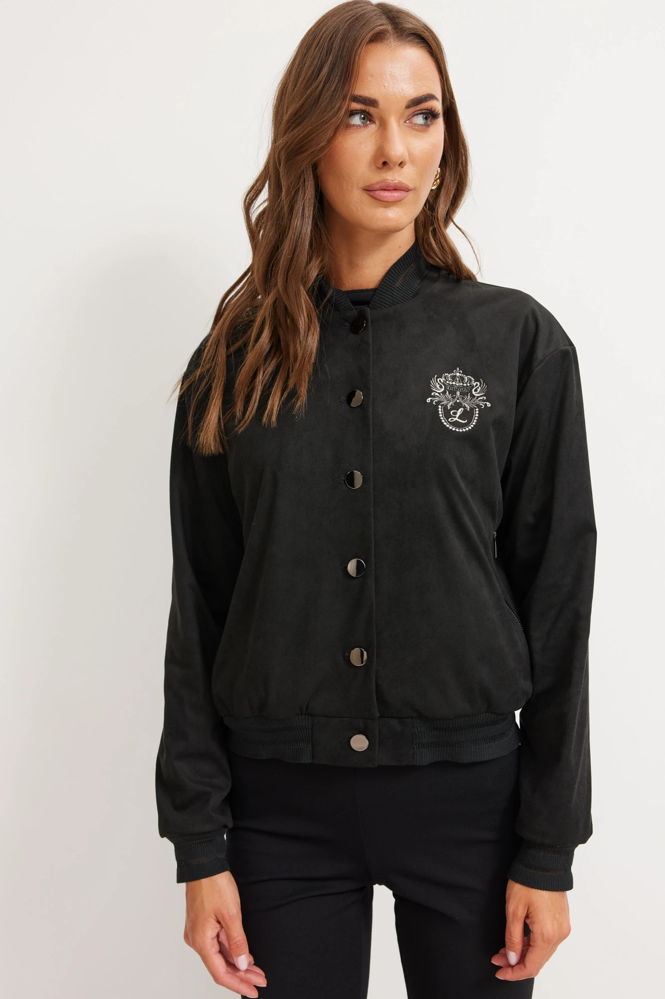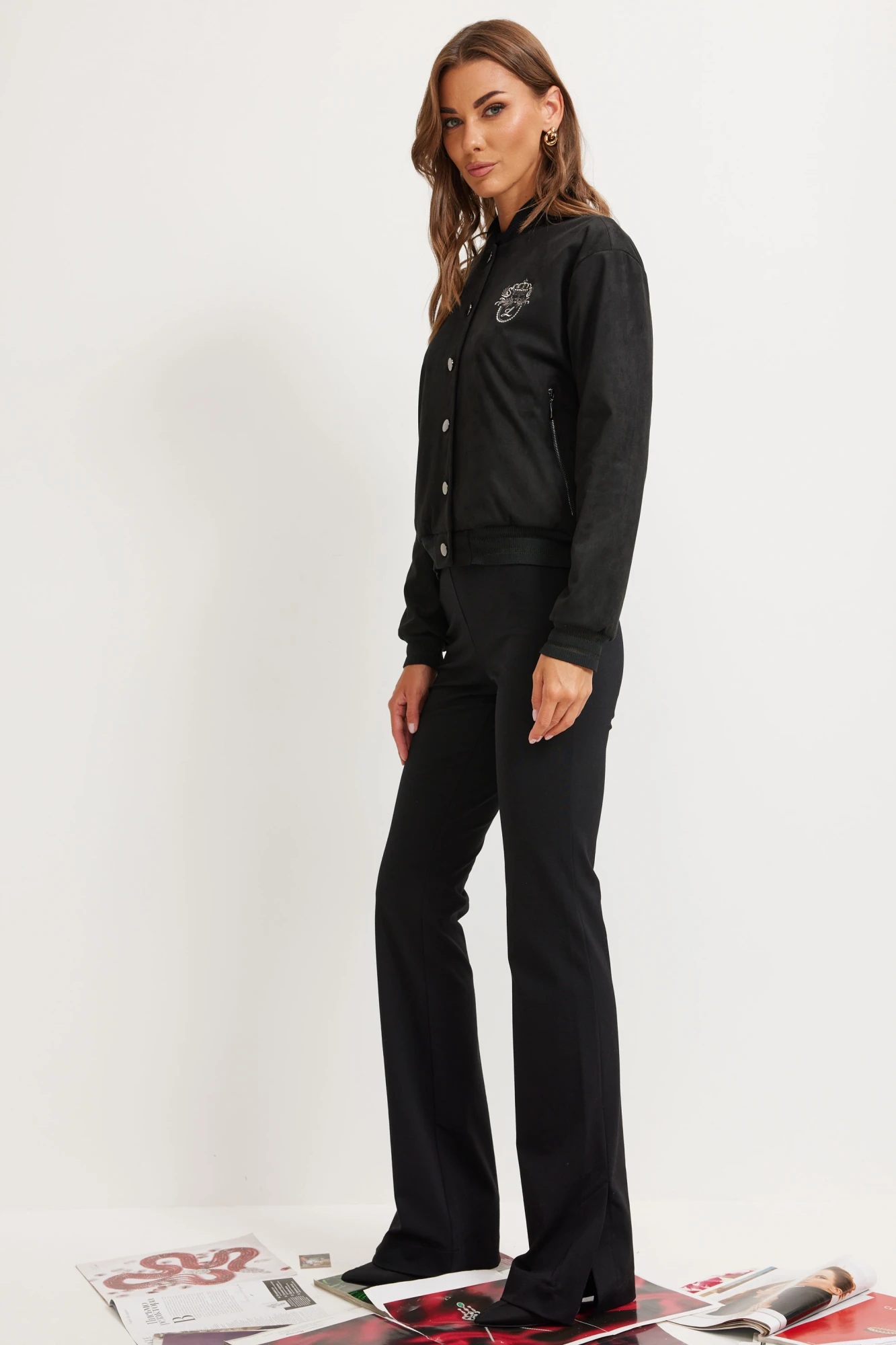 Бомбер прямого силуэта из экозамши. Горловина-стойка, по центру застежка на петли и пуговицы. Рукав втачной длинный по низу манжета. По низу бомбера притачной пояс. На левой стороне полочки дизайнерская вышивка. Обращаем ваше внимание, что фурнитура может отличаться от фото.