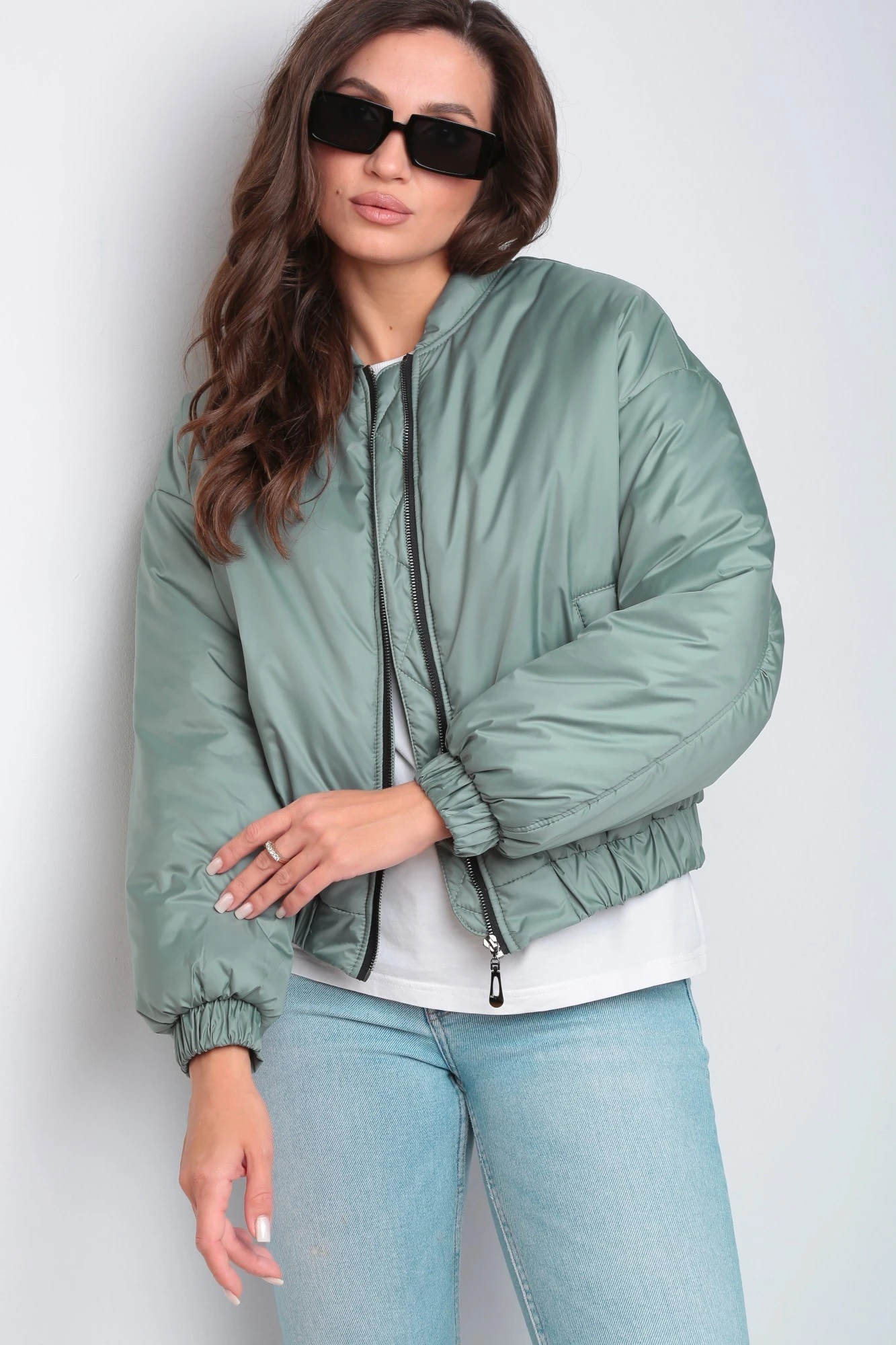 Куртка “бомбер” утепленная (микрофайбер 150гр/м2) на подкладке свободного кроя со спущенной линией плеча и воротником стойкой. Застежка центральная на молнию. Спинка с кокеткой. Рукав втачной, двух шовный со сборкой в локтевой области, низ рукава с притачной манжетой на резинке. По переду прорезные карманы с листочкой. Низ куртки с притачной манжетой со сборкой на эластичную ленту. Рассчитано на температурный режим до -5 (указанная температура комфорта может зависеть от индивидуальной восприимчивости к холоду). На модели “бомбер” 46 размера (параметры модели ОГ-90см ОТ-71см ОБ-102см рост -173см)
