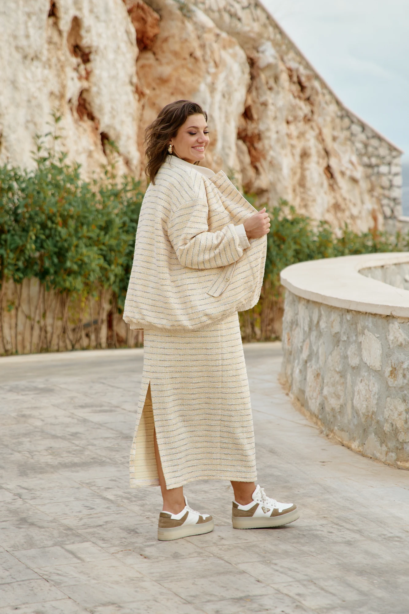 Бомбер- это идеальный переходный элемент. Это выбор для тех, кто ценит комфорт и современные силуэты. Светлый оттенок мгновенно освежает любой базовый образ (с джинсами, брюками, платьем) дополняя и добавляя ему стильности. Бомбер «оверсайз» силуэта с центральной застёжкой на петли пуговицы по краю борта, горловина округлой формы с воротником-стойкой из отделочной ткани. По переду бомбера фигурный рельеф с декоративным отделочным кантом из отделочной ткани, функциональными карманами с клапаном. Спинка без особенностей. Линия плеча спущенная, рукав втачной, длинный со сборкой на притачной манжет из отделочной ткани. Для удобного прилегания манжета к руке вставка резинки. По низу бомбера притачной пояс на резинке из отделочной ткани. Бомбер на подкладке. Длина бомбера 71 см, длина рукава 72,5 см (р 50-54), 73,5 см (р 56-60).