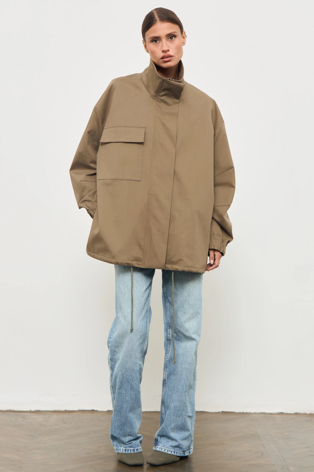 Куртка из хлопковой ткани, большого объема, со спущенной линией плеча. По переду накладной карман, застежка на молнию и приточную планку на пуговицах. Рукав одношевный, низ обработан эластичной тесьмой. По низу куртки кулиса с декоративным шнурком. Воротник стойка.