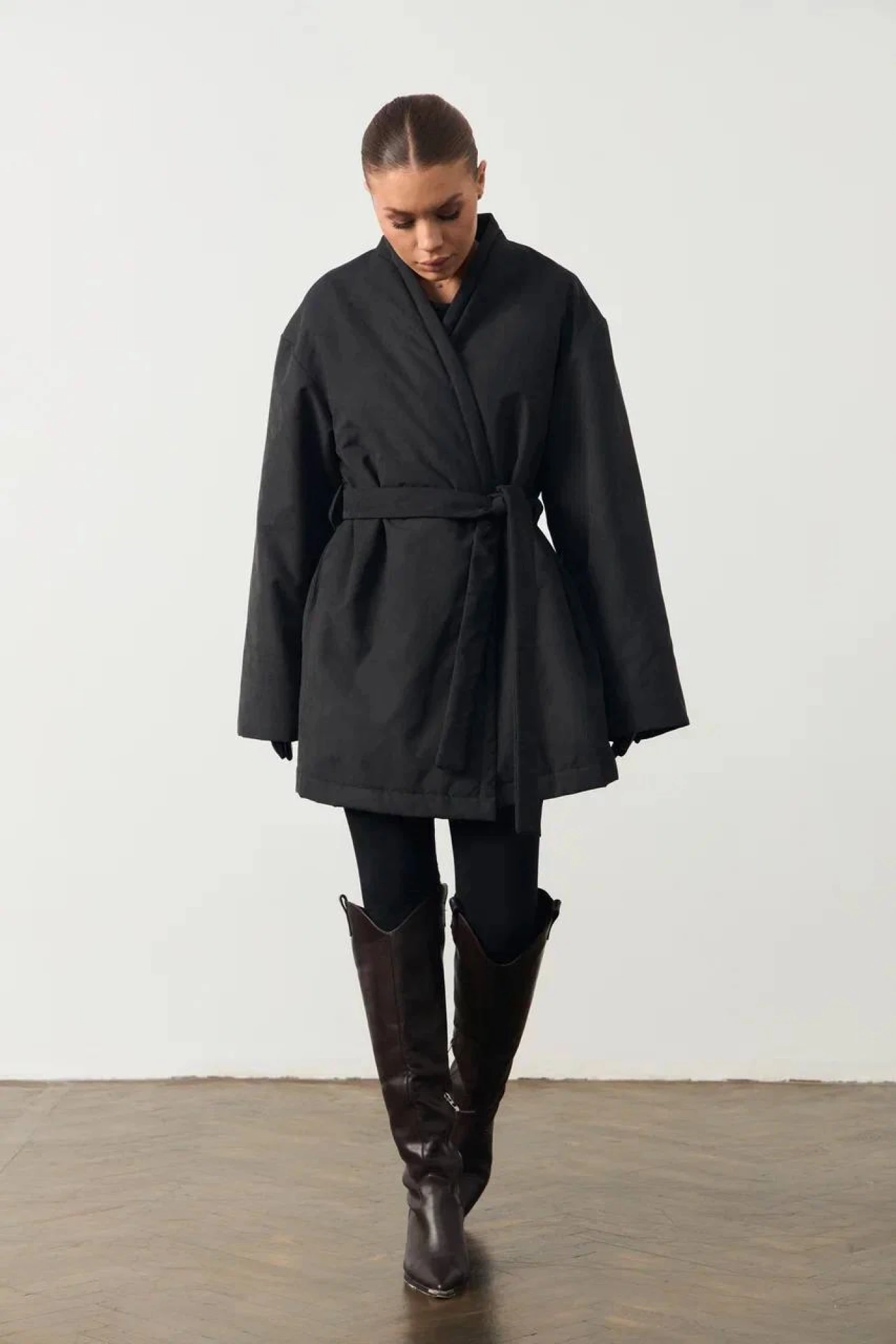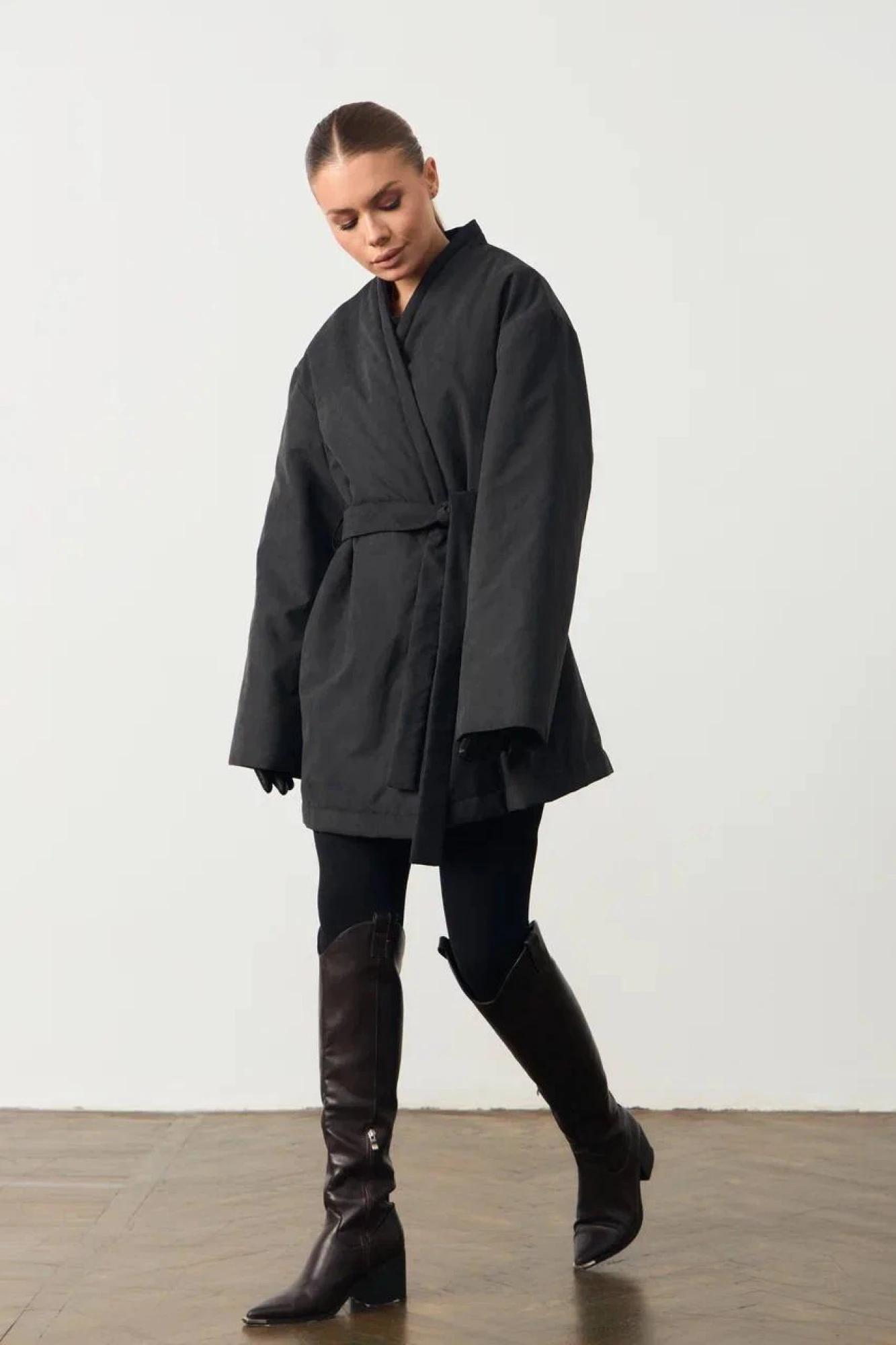 Куртка-кимоно из водостойкой плащёвой ткани. В боковых швах карманы. По краю борта отстрочки.Модель с поясом.