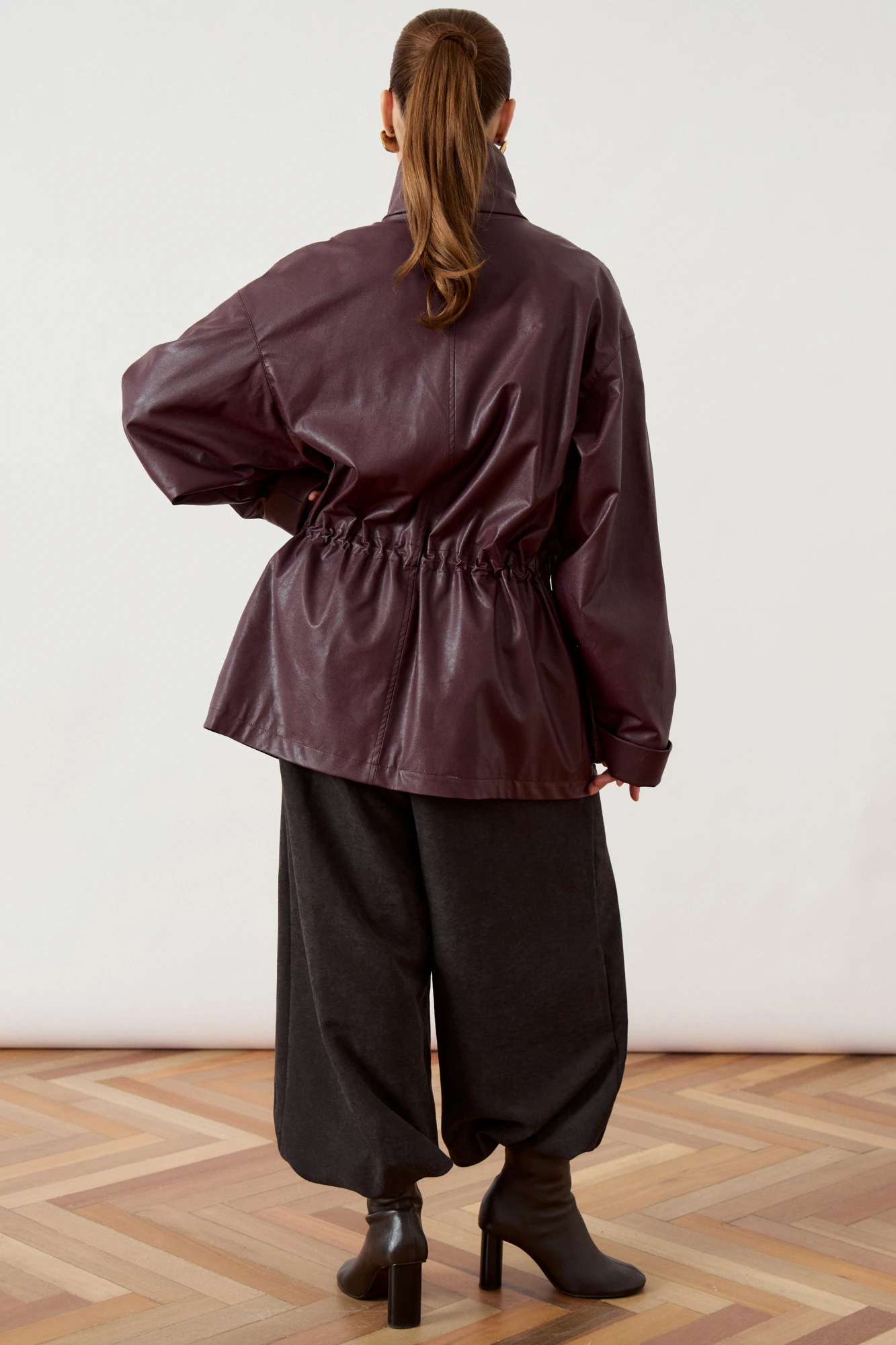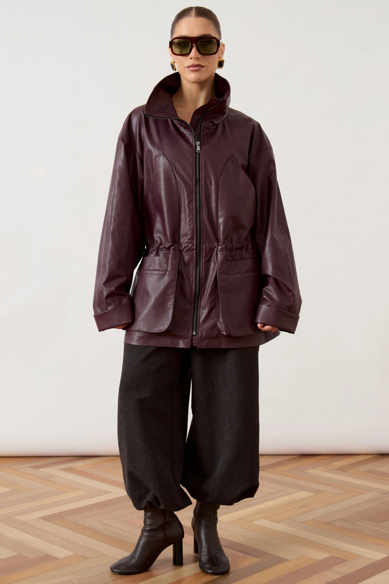 Куртка женская, свободного прямого силуэта, из мягкой экокожи. Модель со спущенной линией плеча и воротником-стойкой оригинальной формы. Центральная застежка на открытую тесьму-молнию во всю длину. По линии талии проходит кулиска с регулируемым шнуром для акцента на фигуре. Перед оформлен сложными фигурными рельефами. В нижней части расположены крупные накладные карманы с клапанами. Рукав широкий, втачной, с притачной широкой манжетой по низу. Изделие на подкладке.