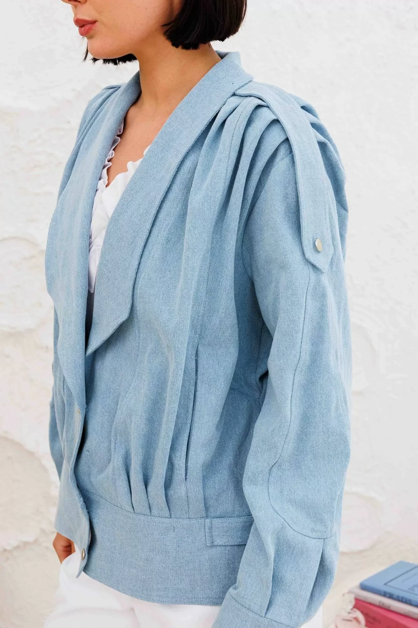 куртка деним выполнена в стиле винтаж. рукав спущенный, по передним половинкам залоены складки, переходящие на задние полвинки. по плчам обработаны паты с пуговицей. отлоной воротик. по низу издели приачная деталь, имее паты по боковым швам. застежка - пуговицы. силуэт овверсайз.