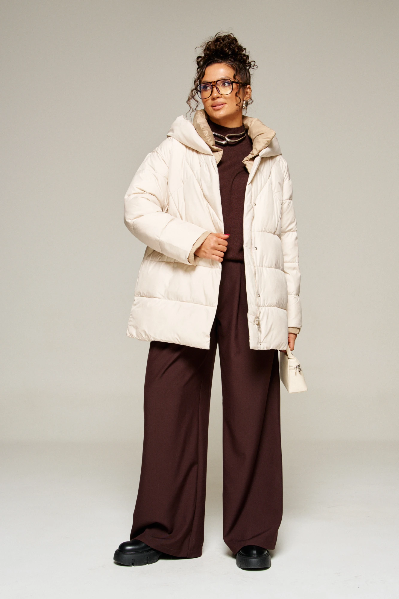 Современный объёмный крой и спущенная линия плеч создают расслабленный актуальный силуэт. А широкий воротник играет роль дизайнерского акцента.