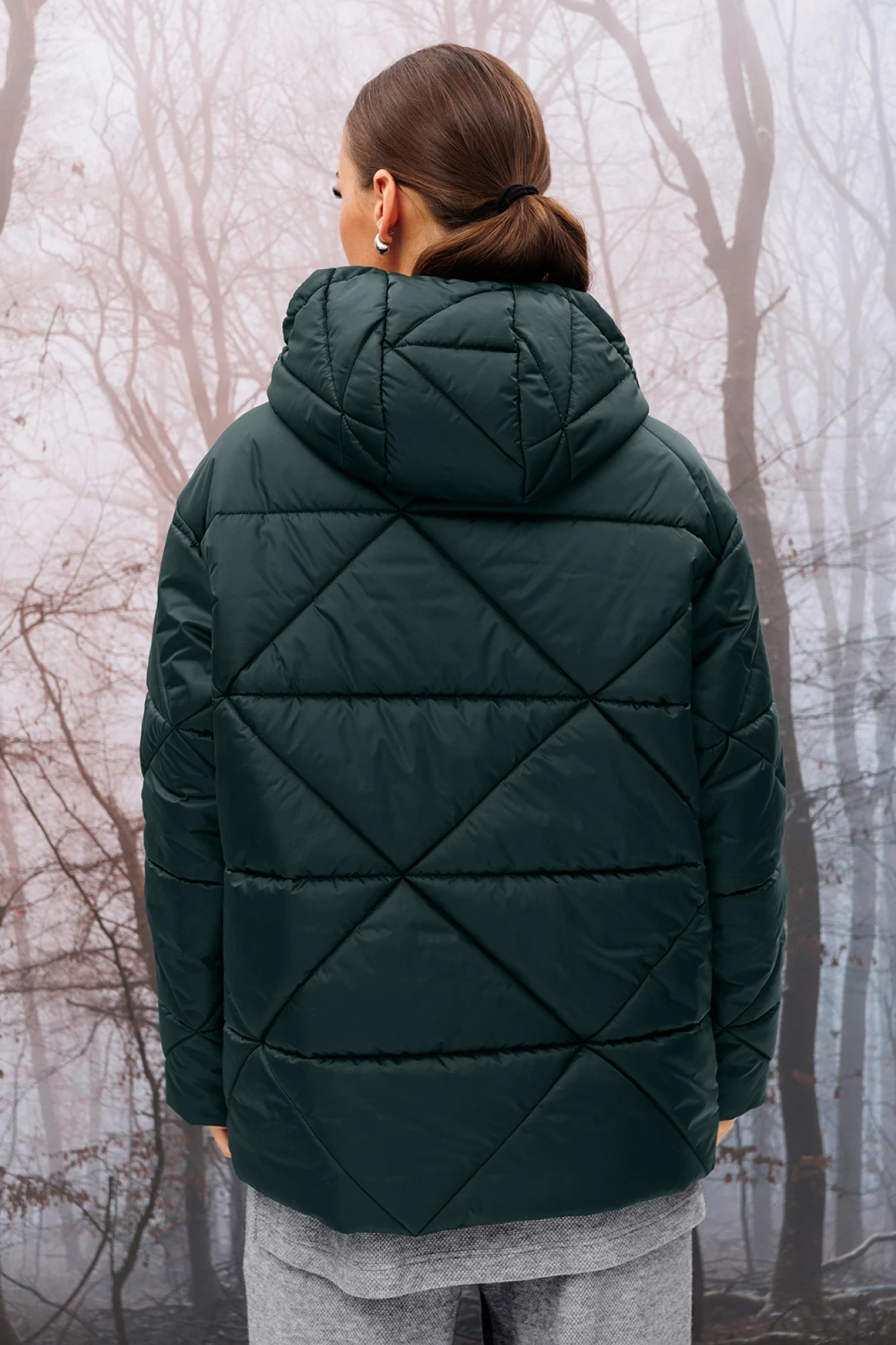 Куртка прямого силуэта со спущенным плечом с центральной застежкой на тесьму молнию и планкой с застежкой на кнопки. По переду накладные карманы с клапаном с застежкой на кнопки. По низу рукавов резинка. Куртка с несъемным капюшоном, в который вставлена эластичная тесьма с фиксаторами. Куртка из плащевой ткани с фигурной стёжкой на синтепоне и подкладке. Декоративные съемные элементы не входят в комплект.