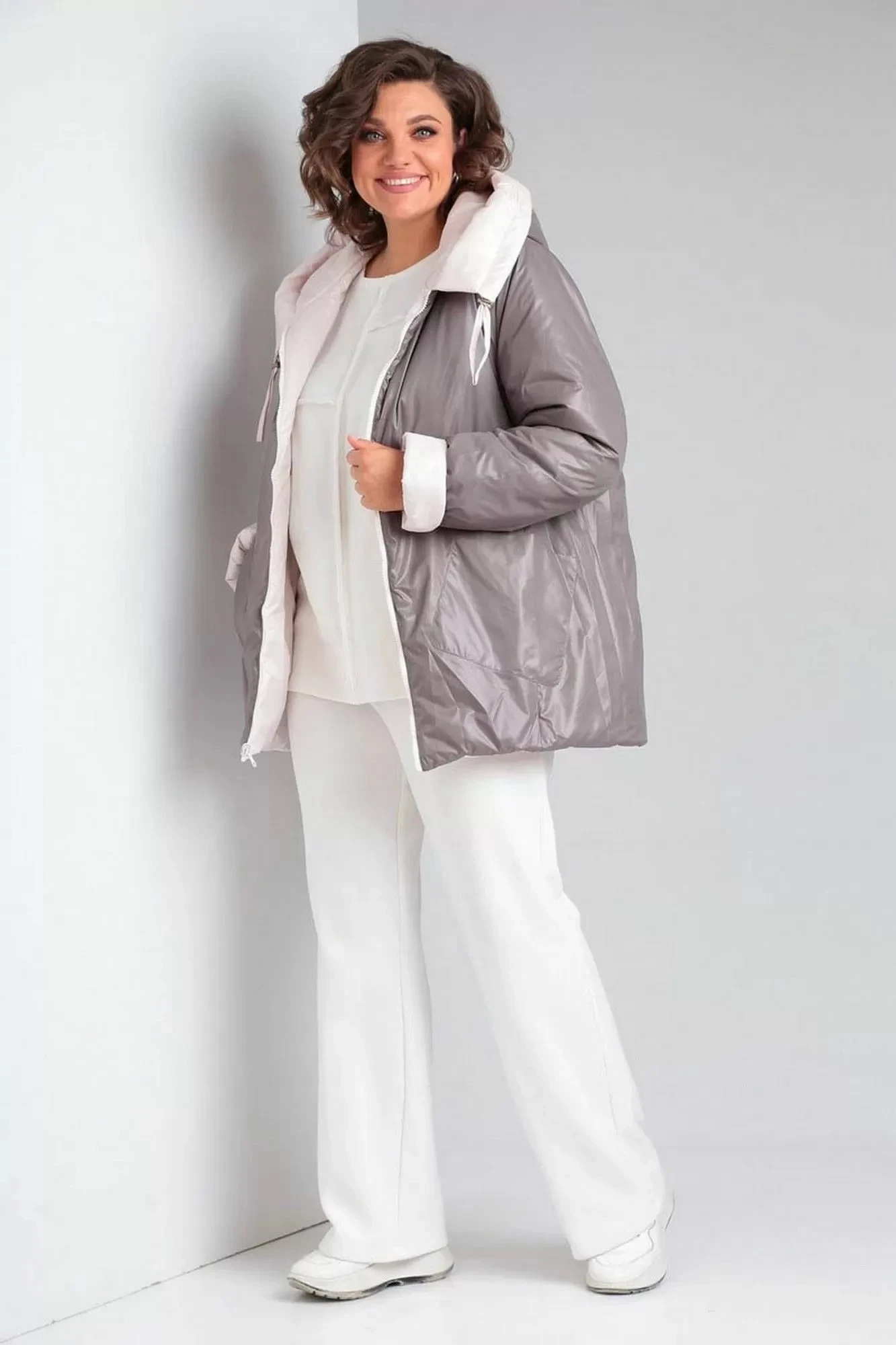 Куртка женская,двусторонняя, полуприлегающего силуэта , с центральной застёжкой на тесьму -молнию. По переду рельефные швы от проймы до низа, в которых обработаны карманы с застёжкой на тесьму-молнию. Капюшон с центральной частью и с отделочной деталью по отлету, по краю капюшона кулиса. Рукав втачной 2-шовный. В качестве отделки используется декоративная стёжка и фурнитура.