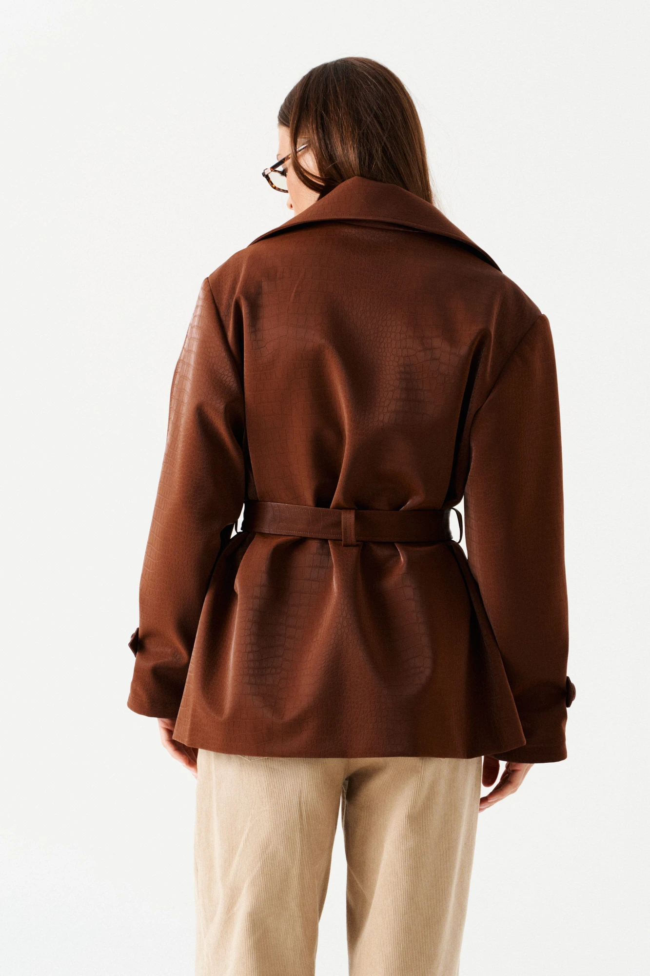 Куртка прямого кроя, свободная, с центральной двубортной застежкой на петли и пуговицы, отложным воротником с отрезной стойкой, с застежкой под горло, на подкладке. По переду два прорезных кармана с листочкой. Спинка цельная, со шлевками. По низу рукавов паты, зафиксированные петлями и пуговицами. В комплекте пояс из основной ткани. Куртка имеет две версии стилизации: в прямом расслабленном виде или в приталенном за счет пояса варианте.