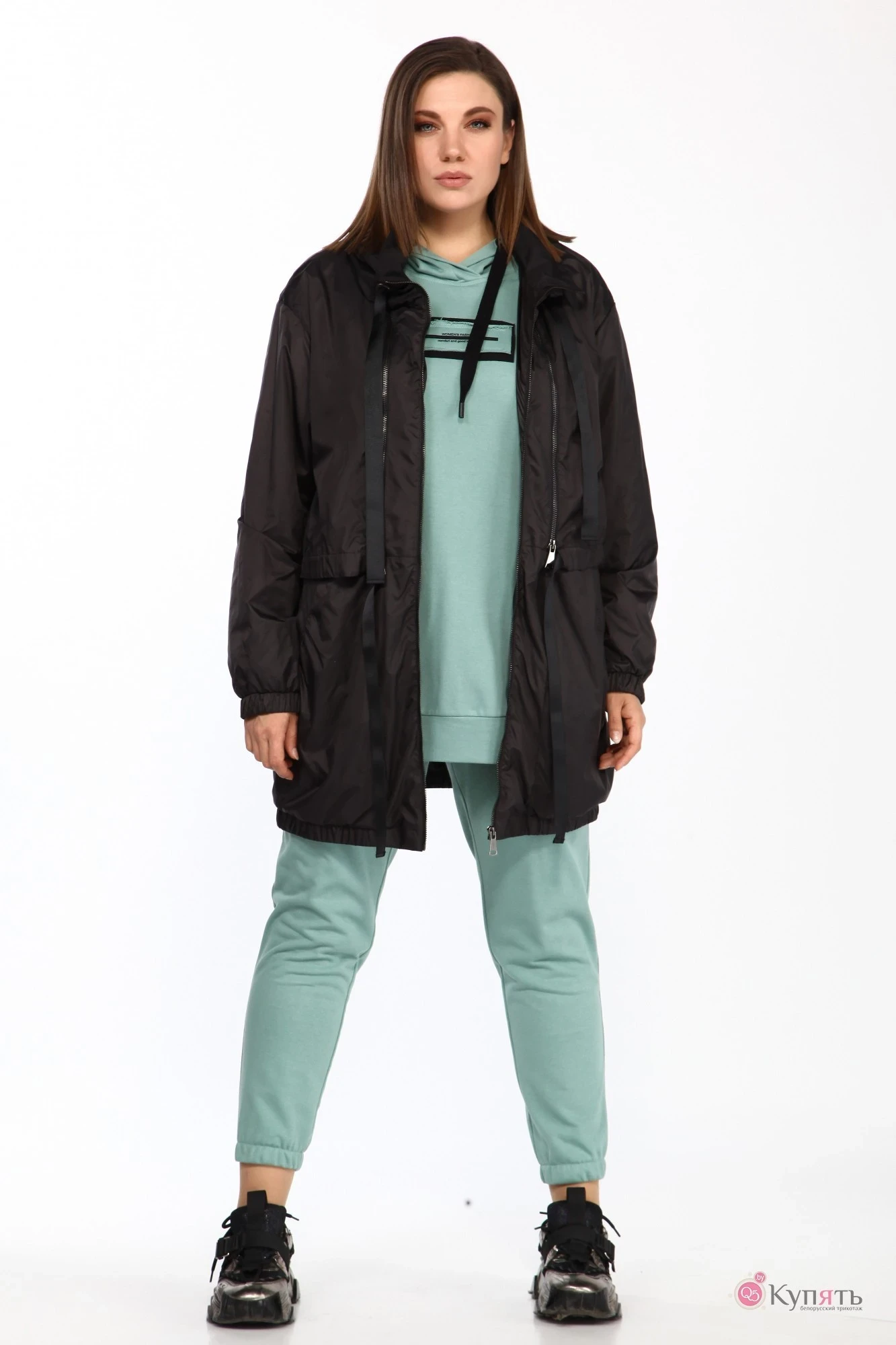 Удлиненная куртка ветровка свободного силуэта, на мембранной подкладке «Barrier», с накладными карманами и кокеткой. По отлету кокетки вставлена декоративная тесьма, для регулировки объема талии. По переду вертикальный отлет кокетки на молнии, для регулировки объема груди, внутренняя часть полочки декорирована кружевом. Рукав втачной на эластичной манжете. Воротник двойная стойка. Низ куртки эластичной присобранной планке. Застежка молния.