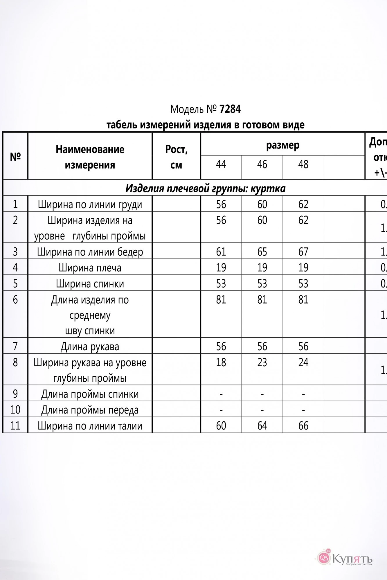 Таблица размеров