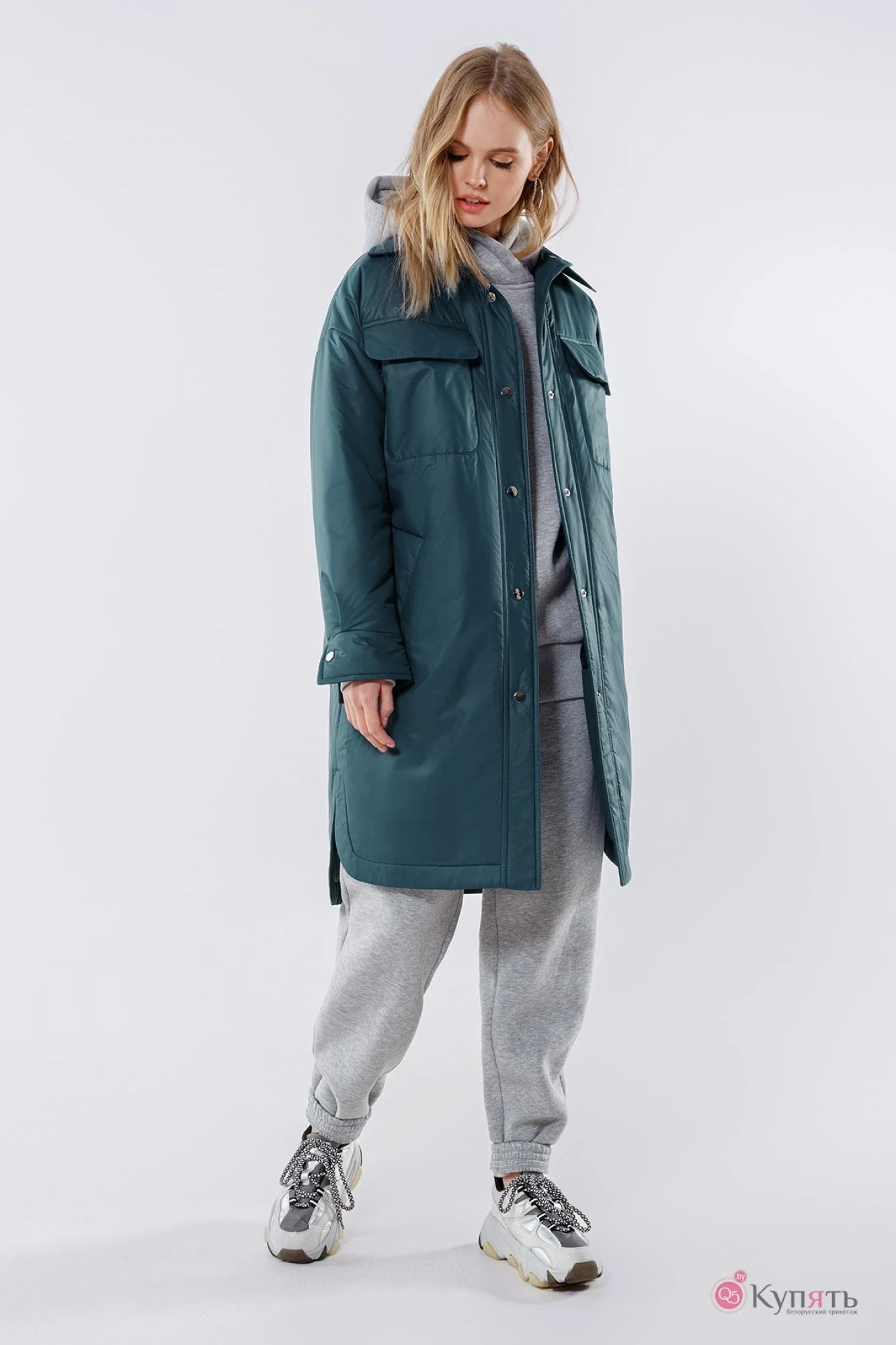 Куртка рубашечного покроя из плащевой водоотталкивающей ткани. Детали: прямой силуэт, спущенная линия плеча, перед с большими накладными карманами и прорезными карманами с листочкой, спинка с кокеткой и средним швом, по бокам высокие фигурные разрезы, застежка на пробивные кнопки. Пальто утеплено синтепоном