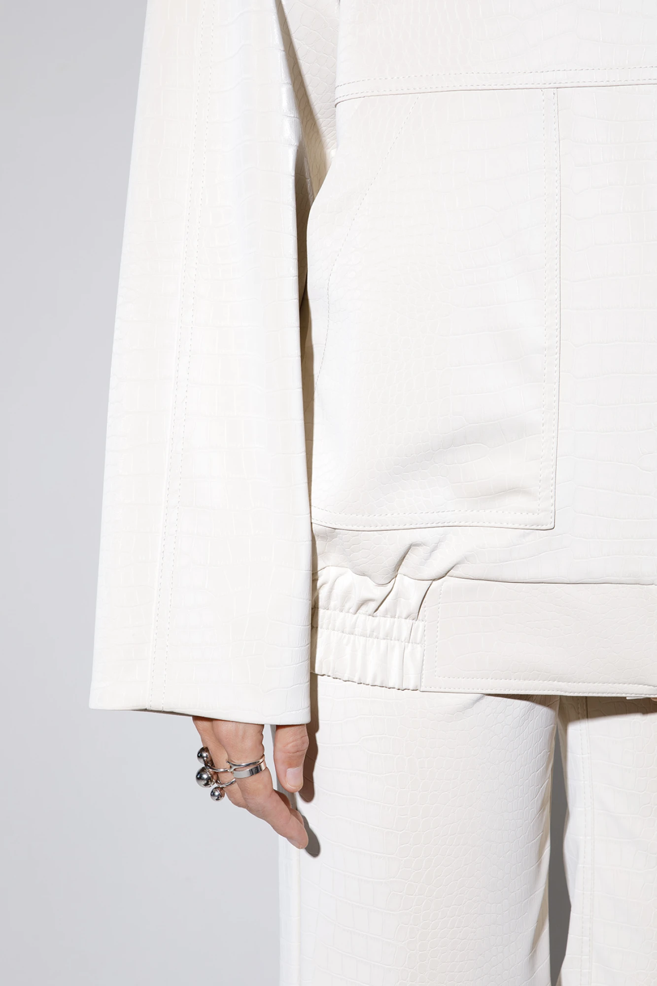 Куртка-бомбер из фактурной экокожи кожи с анималистичным рисунком. Детали: прямой силуэт, воротник-стойка, пояс переда и спинки на резинке, застежка на потайные металлические кнопки, рукава длинные с высокими обтачками по низу, которые при необходимости можно подвернуть; большие накладные карманы по переду, спинка со средним швом, куртка на подкладке. Длина по спинке с поясом около 64 см в размерах 40-46 и около 66,5 см в размерах 48-52, длина рукава+ плечо около 50,5+12,5 см