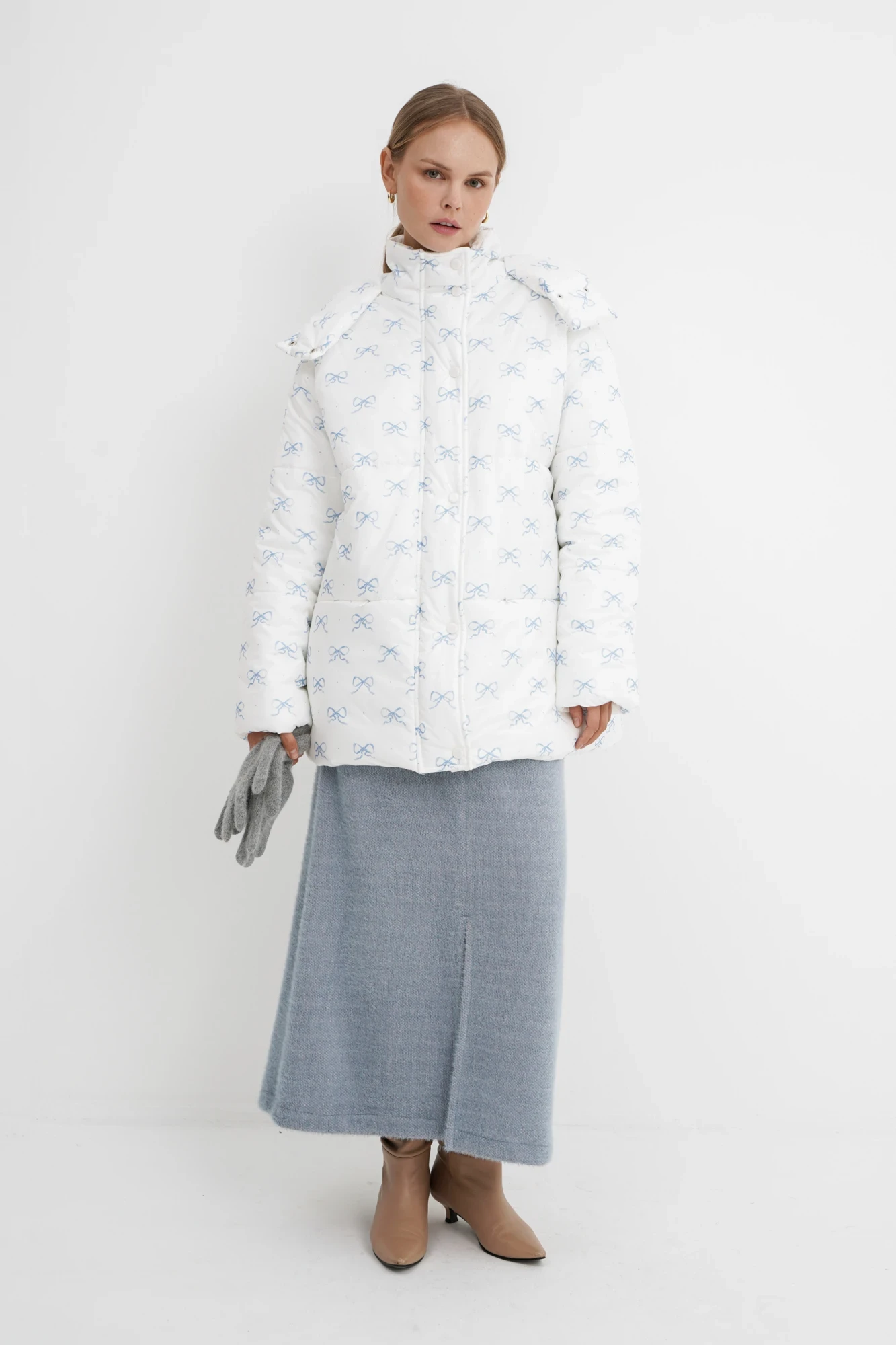 Стеганая оверсайз куртка с принтом. Детали: прямой силуэт, свободый покрой, спущенная линия плеча, капюшон, функциональные карманы, застежка на молнию и пробивные металлические кнопки, куртка на утепленной синтепоном подкладке. Наполнитель куртки ISOSOFT толщиной 200 г/м2. Длина по спинке около 71 см в размерах 40-46 и около 73 см в размерах 48-52, длина рукава+ плечо около 53+8 см