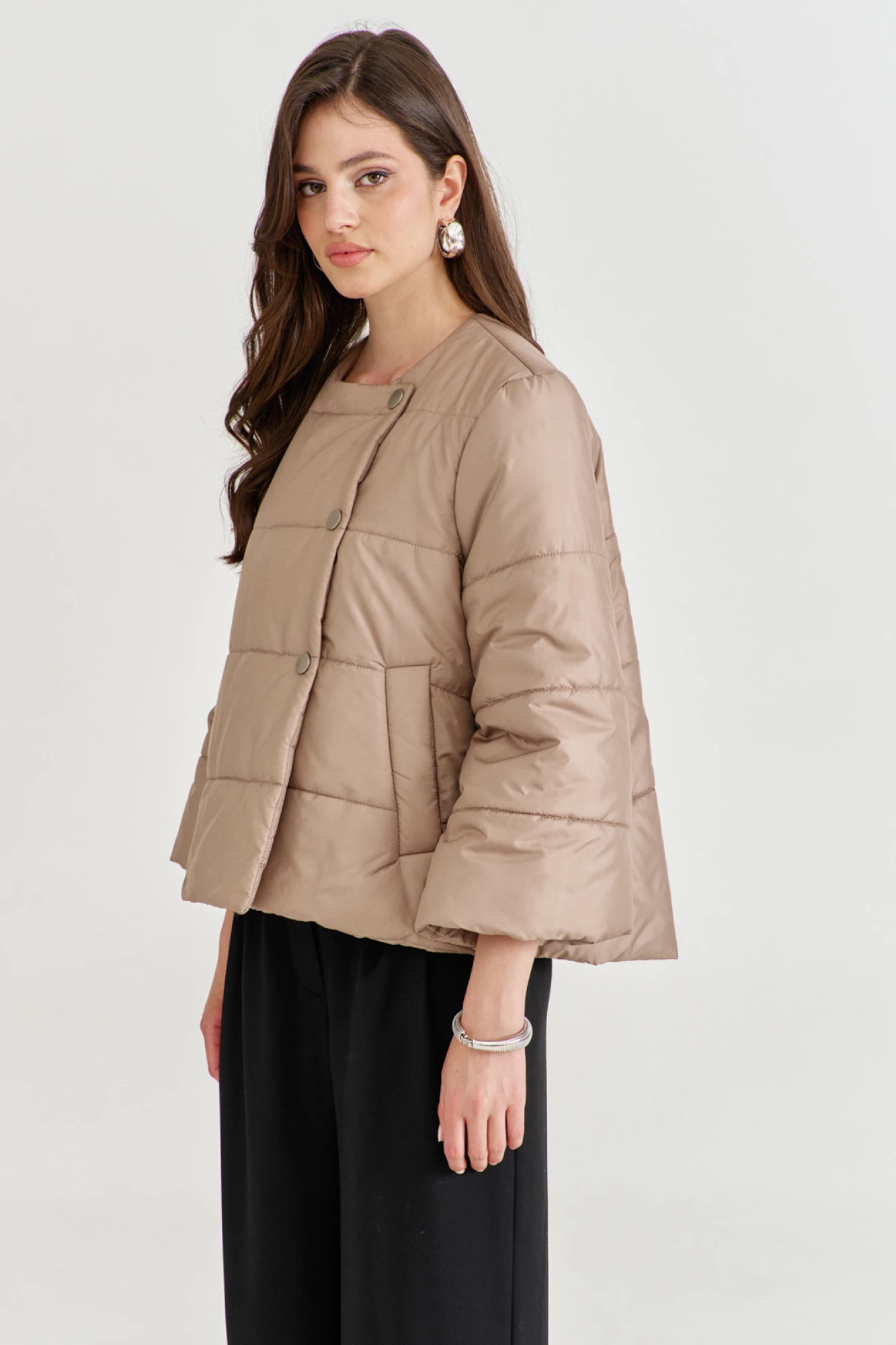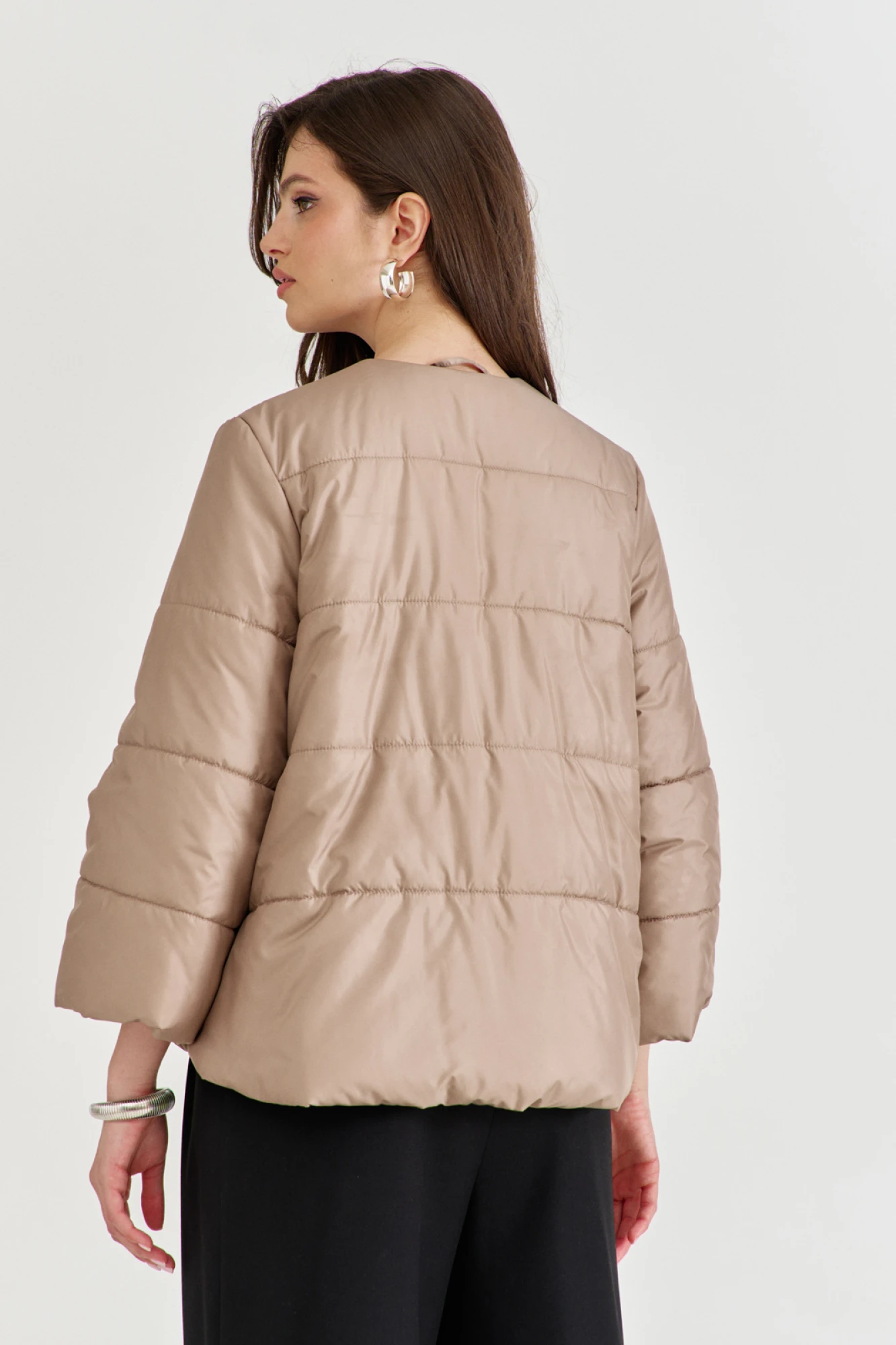 Куртка свободного кроя, длиной выше бедер, по спинке удлинена. Куртка на синтепоне с горизонтальной стежкой. По переду прорезные карманы с листочкой. Рукава одношовные, втачные, длиной 7/8. Горловина округлой формы, без воротника. По переду двубортная застежка на кнопки. Куртка на подкладке.