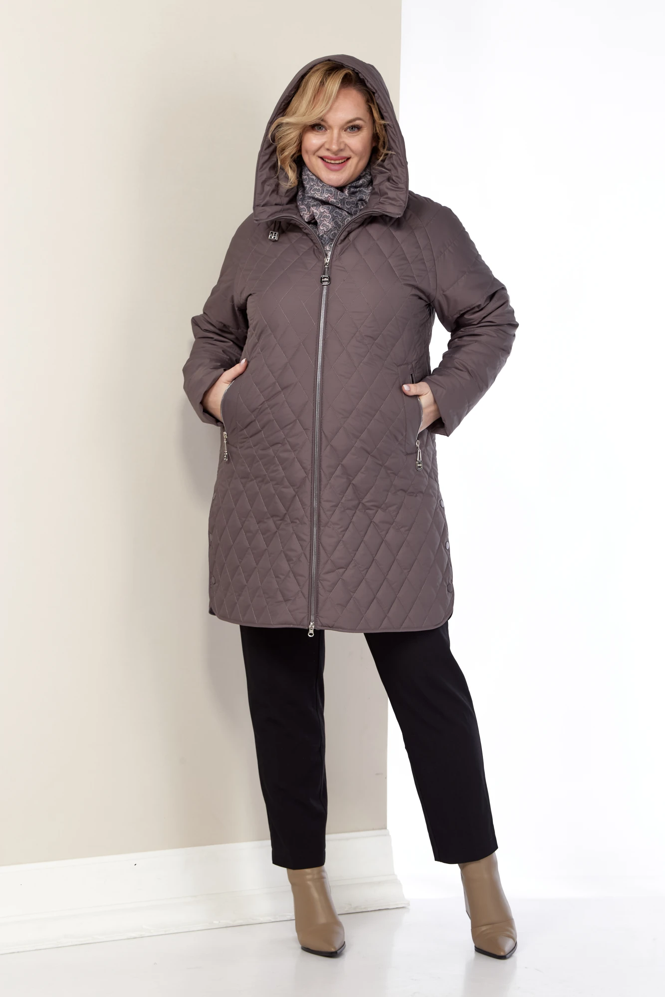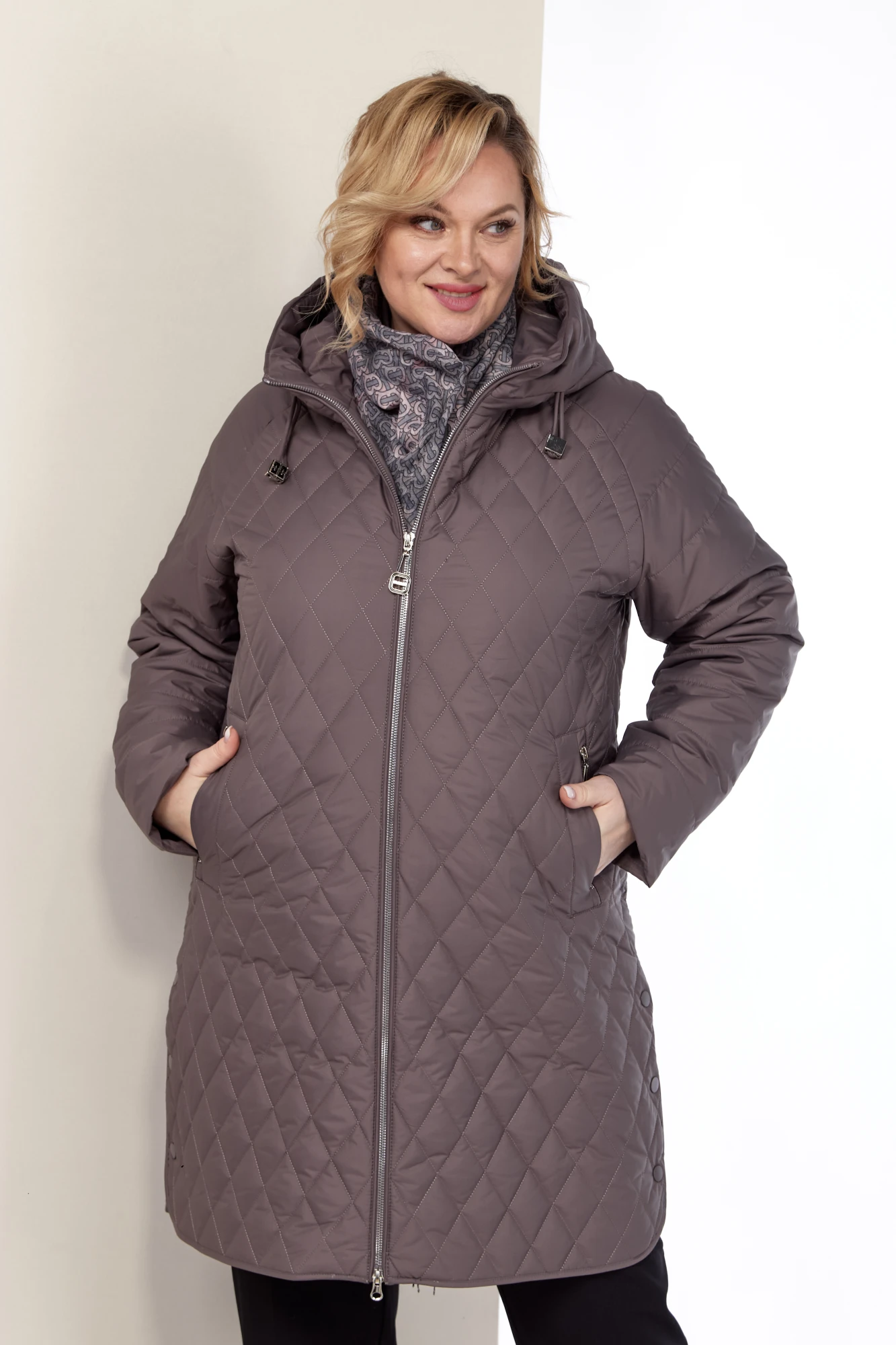 Модная, весенняя куртка на подкладке, классического, прямого силуэта. Перед куртки выполнен стежкой ромбами с двойными, функциональными карманами на молнии и на магнитах. Рукав реглан, длина регулируется с помощью отворота. Застежка центральная на двухбегунковой молнии (расстегивается снизу и сверху). Капюшон не съемный, с фиксирующейся кулисой. Спинка также выполнена стежкой ромбами в сочетании с отрезной кокеткой по низу. В боковых швах куртки декоративная шлица на кнопках. Низ куртки окантован бейкой в тон основной ткани. С внутренней стороны изделия, имеется внутренний карман. Модель на тонком высококачественном синтепоне, который легко восстанавливает форму и не теряет ее после многочисленных стирок. Модель полномерная, с идеальной посадкой. Эта куртка универсальная находка для повседневной носки и подойдет на любой возраст. Будет выгодно смотреться под любой образ и любую обувь.