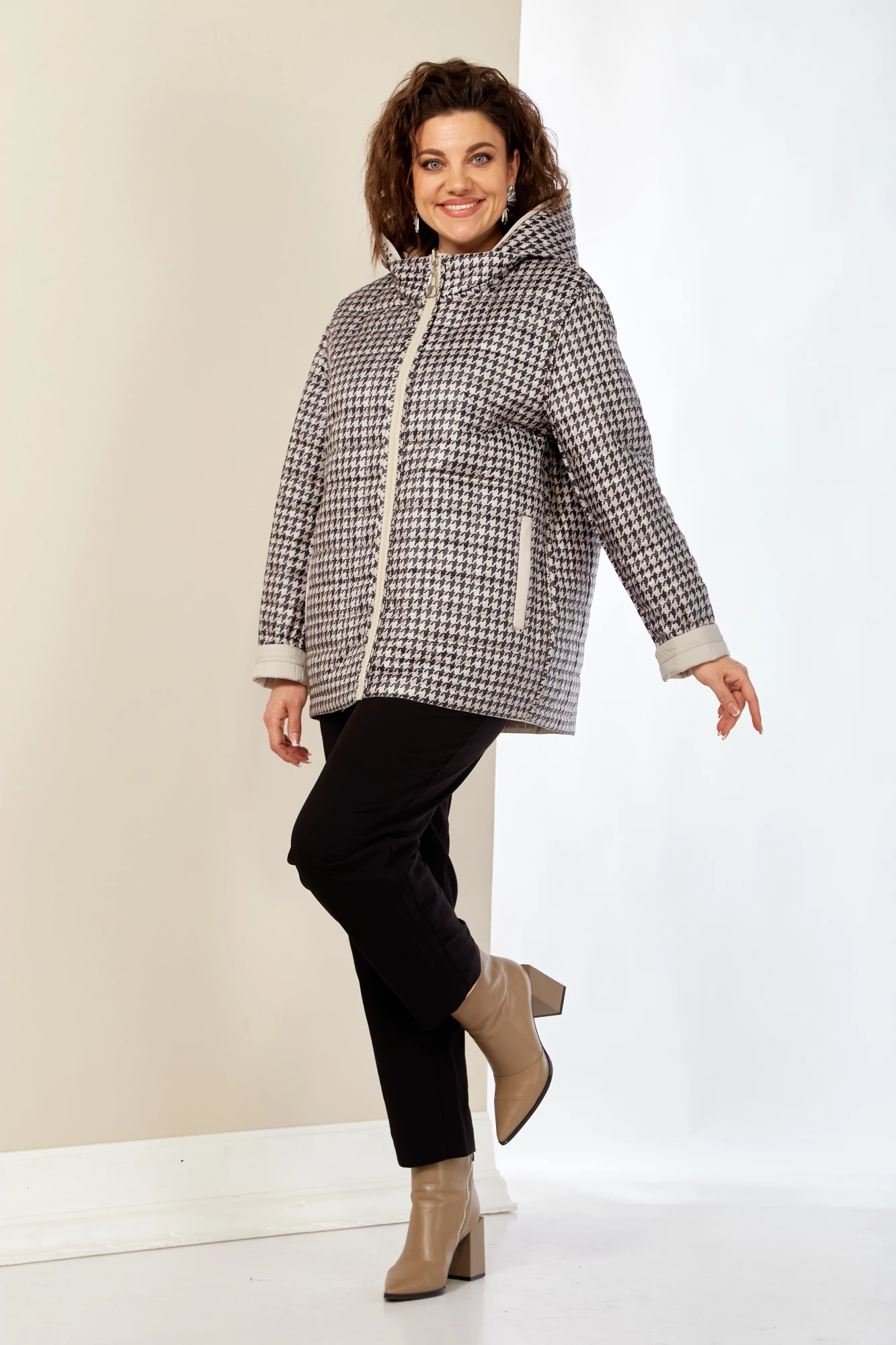 По переду, однотонной стороны изделия, стёжка квадратами и функциональные, накладные карманы на молнии. Капюшон съемный на пуговицах, регулируется при помощи кулиски. Рукав втачной, двухшовный, длина регулируется с помощью отворота.