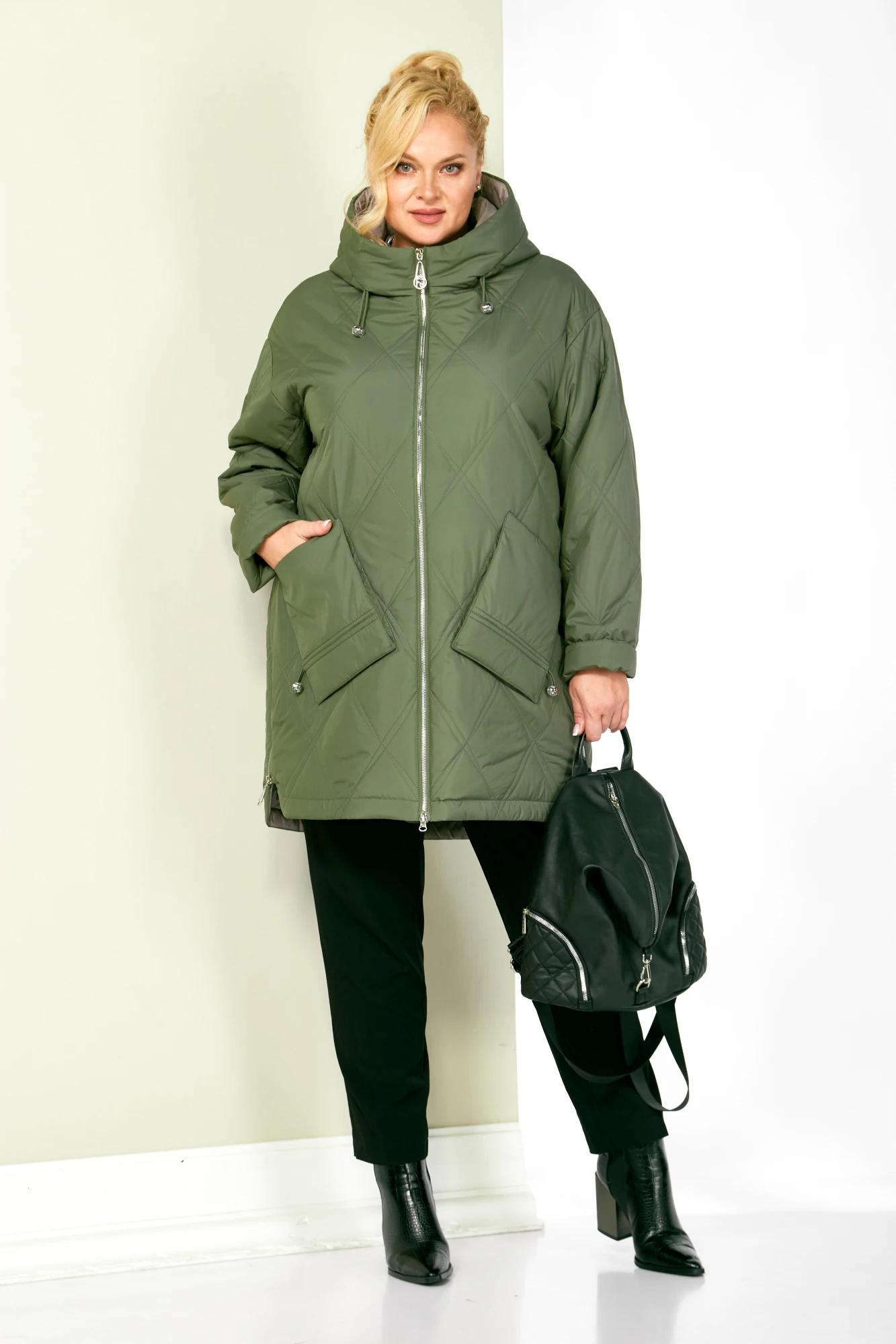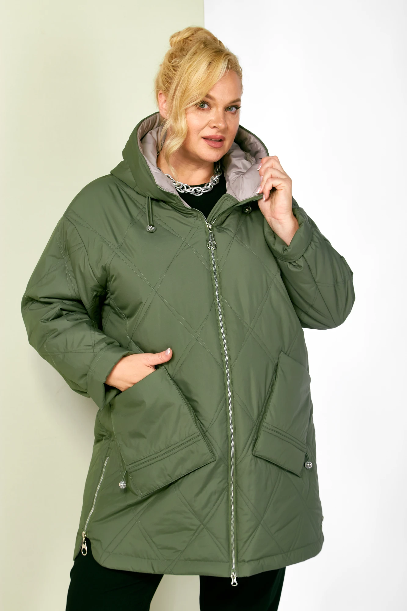 Стильная демисезонная куртка сезона осень-весна, прямого силуэта, с воротником-стойкой переходящим в капюшон. Куртка повседневная удобная в носке, лёгкая в уходе и теплая. Застежка центральная на молнии с двумя бегунками, которая подарит вам свободу движения и подойдет для автоледи. Изделие выполнено из курточной ткани высокого качества, на тонком мягком синтепоне. На подкладке. Капюшон не съемный, регулируется декоративным шнуром. По переду куртки удобные глубокие накладные карманы на внутренних магнитах. Рукав со спущенной линией плеча, длина регулируется с помощью отворота. С внутренней стороны куртки имеется внутренний карман. Нижняя часть боковых швов декорирована молниями (функциональные), что делает её удобной в носке.