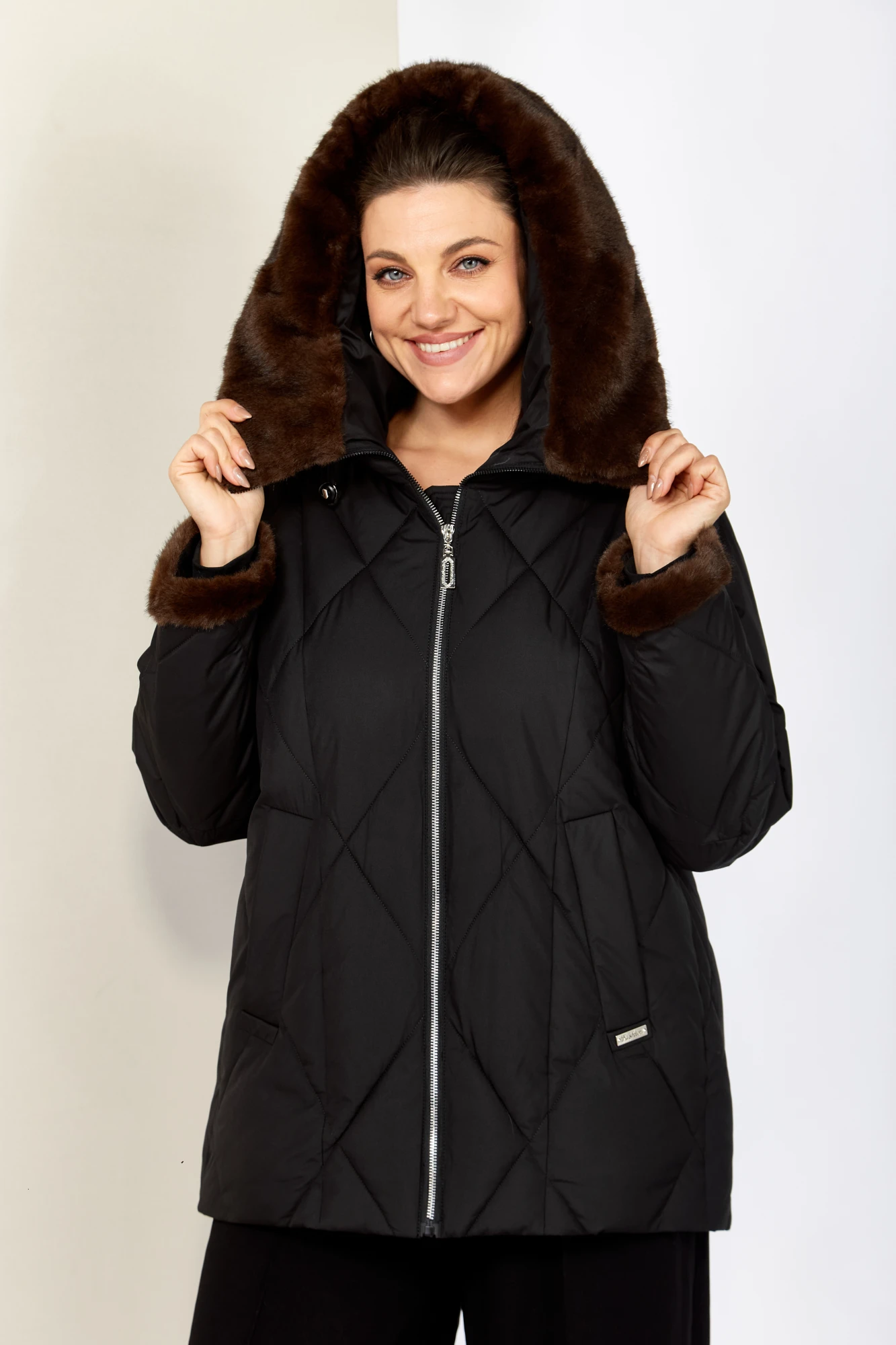 Уютная, элегантная зимняя куртка станет любимой вещью Вашего гардероба! Куртка выполнена из мягкой, матовой курточной ткани с водоотталкивающим эффектом. На качественной сатиновой подкладке из поливискозы. В качестве утеплителя используется «Холлофайбер» (специально разработан для зимних курток) производство Бельгия с плотностью 200 г/кв.м.. Утеплитель по своим характеристикам легкий и прекрасно держит тепло. По переду прорезные карманы с декоративным элементом на магнитах. Рукав реглан. Застежка центральная на тесьму-молнию. Капюшон и отвороты рукавов выполнены из меха, максимально по внешнему виду приближенного к натуральному «Норка», что придает изделию элегантность.