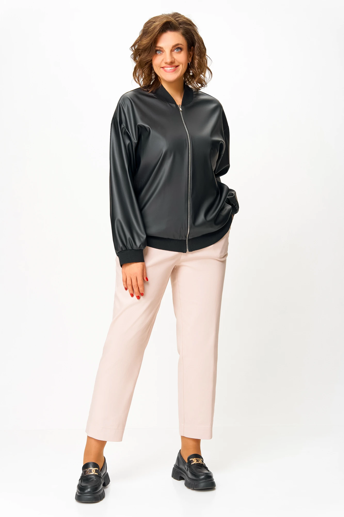 Бомбер женский из мягкой экокожи на подкладке свободного кроя со спущенной линией плеча и с центральной застёжкой на декоративную металлическую молнию. Полочка с отрезными бочками и карманами в швах. Горловина округлая со стойкой из трикотажного довяза. Рукав длинный. По низу рукава и изделия - довяз.