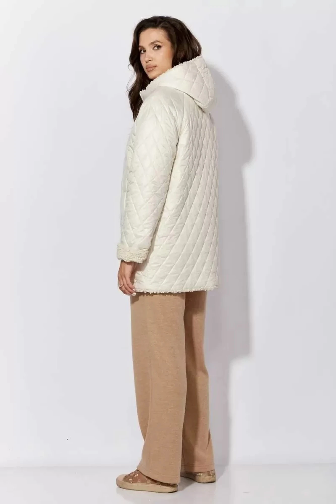 Куртка женская, демисезонная. Верх куртки-плащевка, стеганная на синтепоне. Подкладка-эко-мех "барашек". Куртка прямого силуэта с длинным рукавом "реглан" Длина рукава может регулироваться отворотом. По переду центральная застежка на "молнию" и прорезные, функциональные карманы. Горловина оформлена капюшоном стойкой по переду.