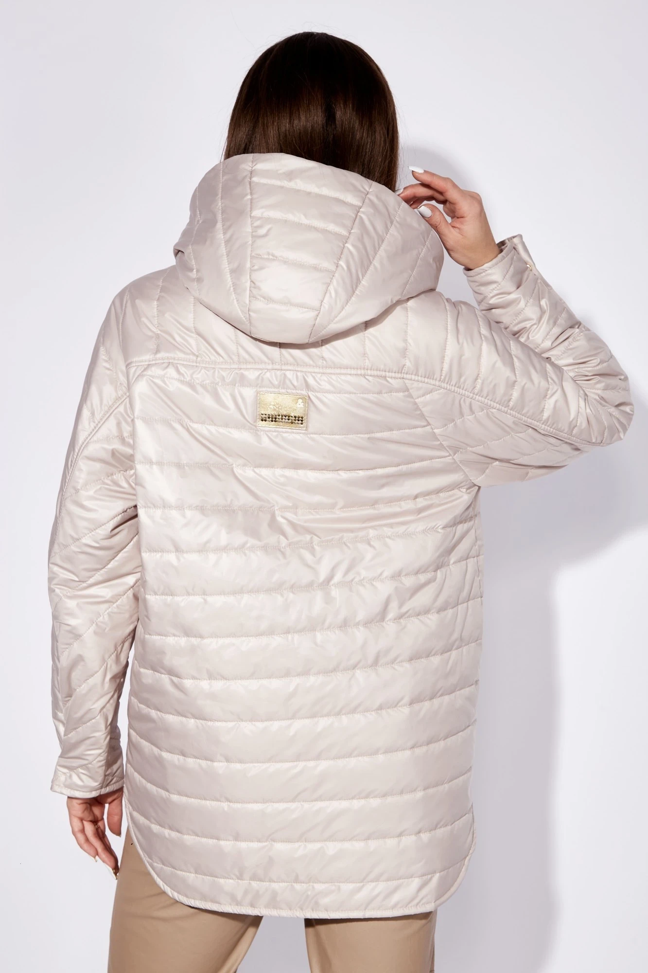 Куртка женская, прямого силуэта, выполнена из двухсторонней, стеганой на синтепоне (W100) плащевки. Рукав длинный, покроя реглан. По низу рукава кнопка, регулирующая ширину рукава. Горловина оформлена капюшоном. Застежка центральная, с отрезной планкой, на кнопки. По спинке фигурная кокетка, переходящая на рукав и декоративная нишивка. По переду накладные карманы с клапанами. Низ куртки фигурной формы, по спинке удлинен. Все внутренние швы окантованы.