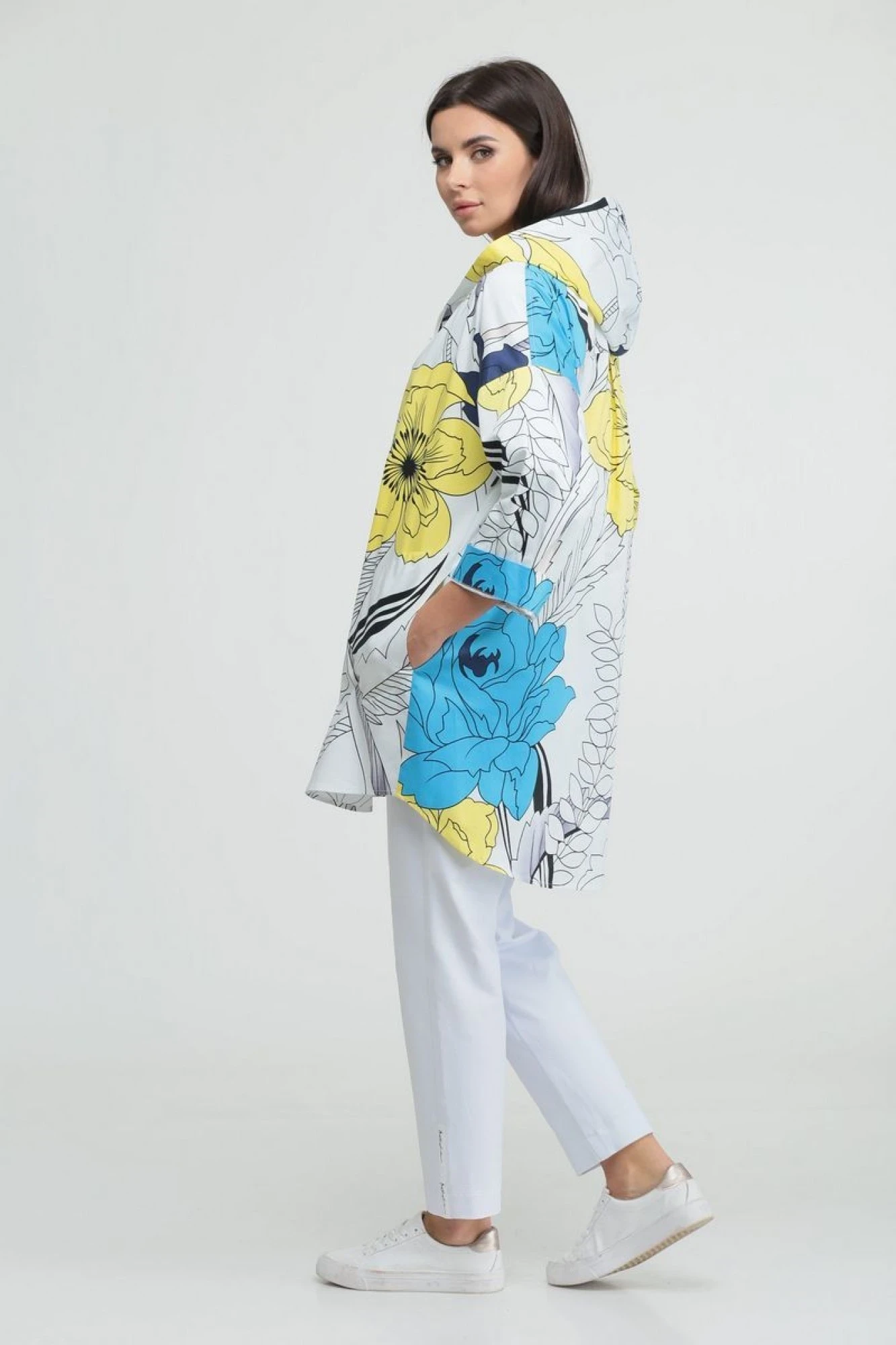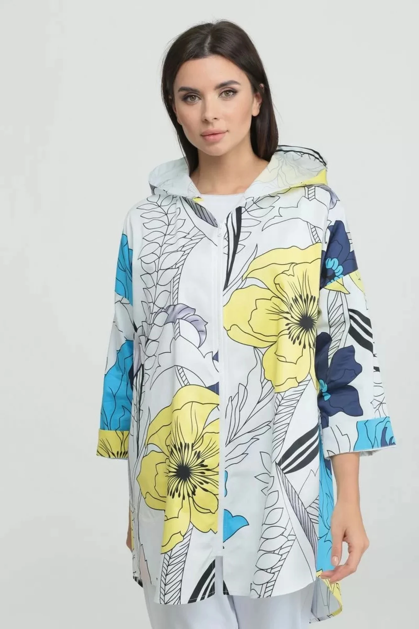 Куртка без подкладки из хлопка-атласа удлиненная, со спущенной линией плеча, капюшоном, карманами в боковых швах, фигурным низом, на застежке-«молния». Спинка с притачной кокеткой и складкой по центру. Рукав втачной одношовный, с широкой подгибкой для отворота. Вырез горловины круглый.