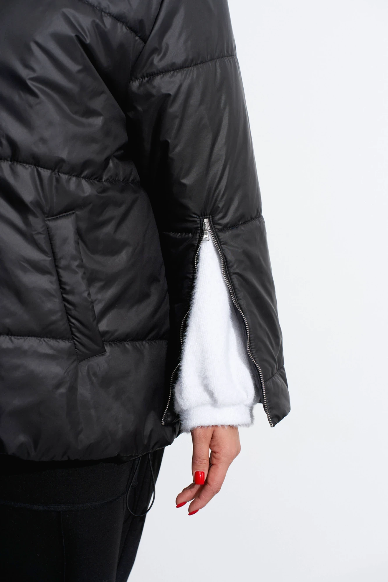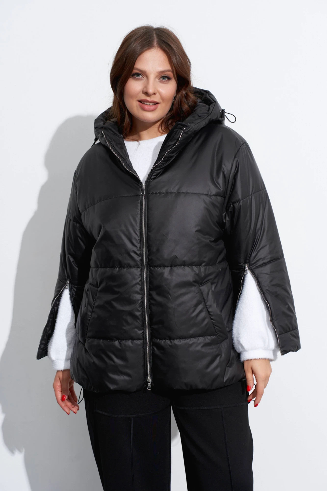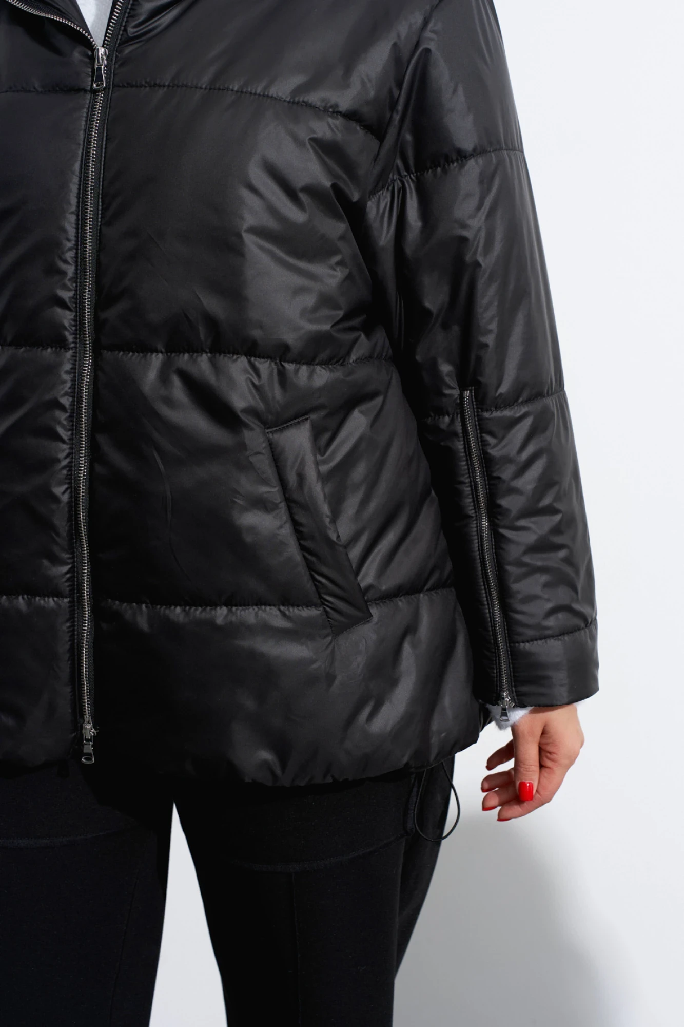 Куртка на утеплителе, с капюшоном. Спереди обработаны карманы с листочками и застёжка на молнию. Капюшон с регуляторами стяжки объёма. Объём низа куртки регулируется и фиксируется у боковых швов. Рукава с разрезами на молниях. Изделие на подкладке.