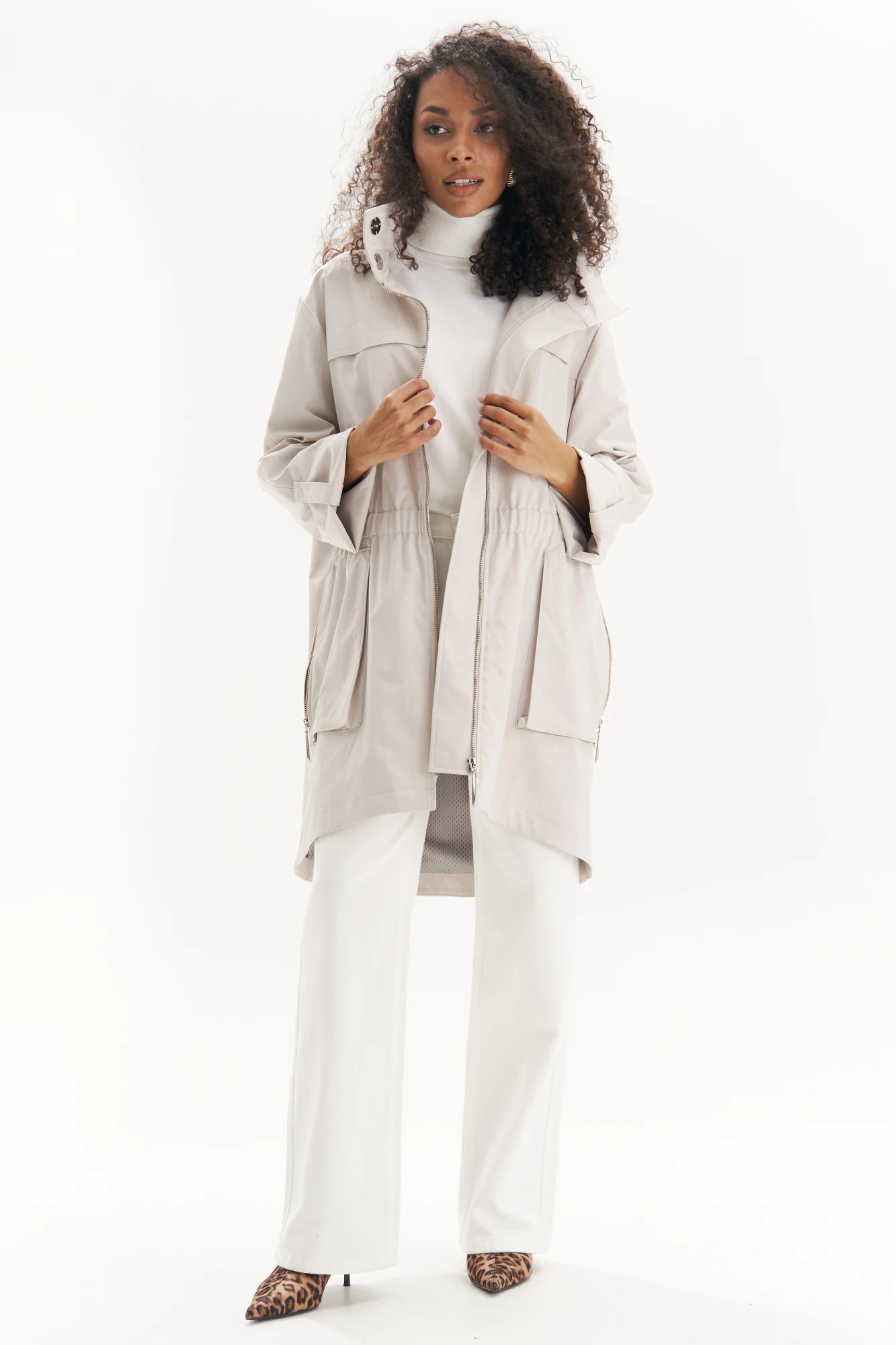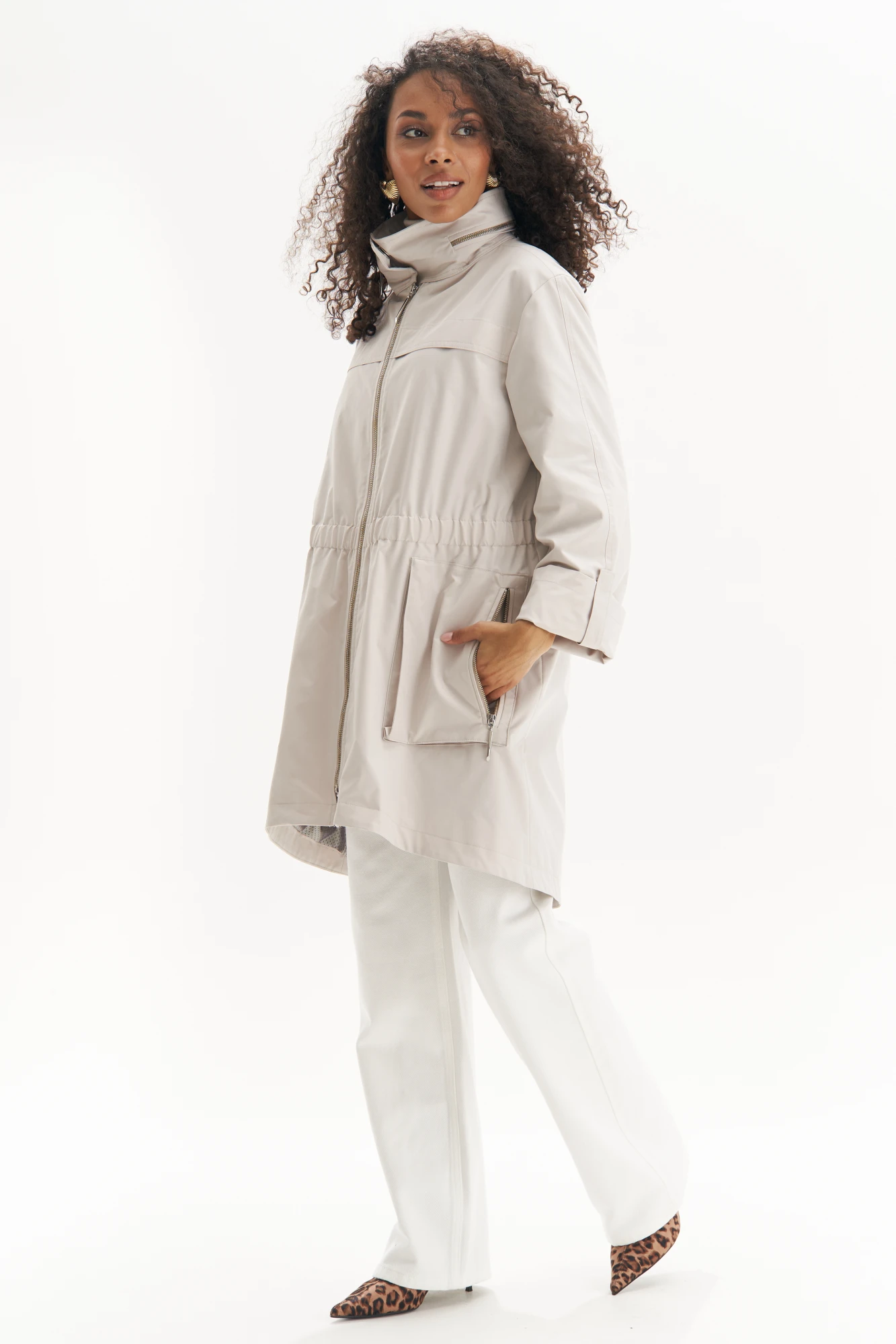 Эта легкая куртка – идеальный баланс между стилем и комфортом. Выполненная в универсальном светлом оттенке, она придает образу свежесть и элегантность, а свободный силуэт с утяжкой на талии подчеркивает фигуру, создавая женственный силуэт. Эта куртка станет стильной основой для любого весенне-осеннего гардероба!