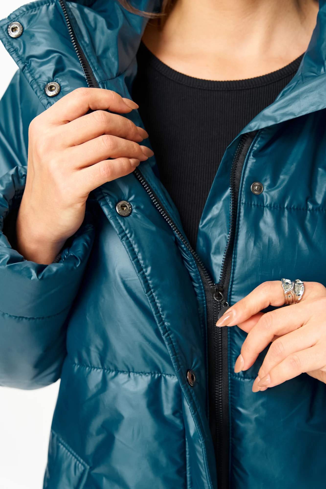 Полочка с центральной застежкой на молнию и притачной планкой с застежкой на кнопки. На полочке выполнены карманы с листочкой. Спинка цельная . Пальто с капюшоном. Рукав одношовный, втачной, по низу рукава, с внутренней стороны настрочена резинка. Пальто на подкладке.
