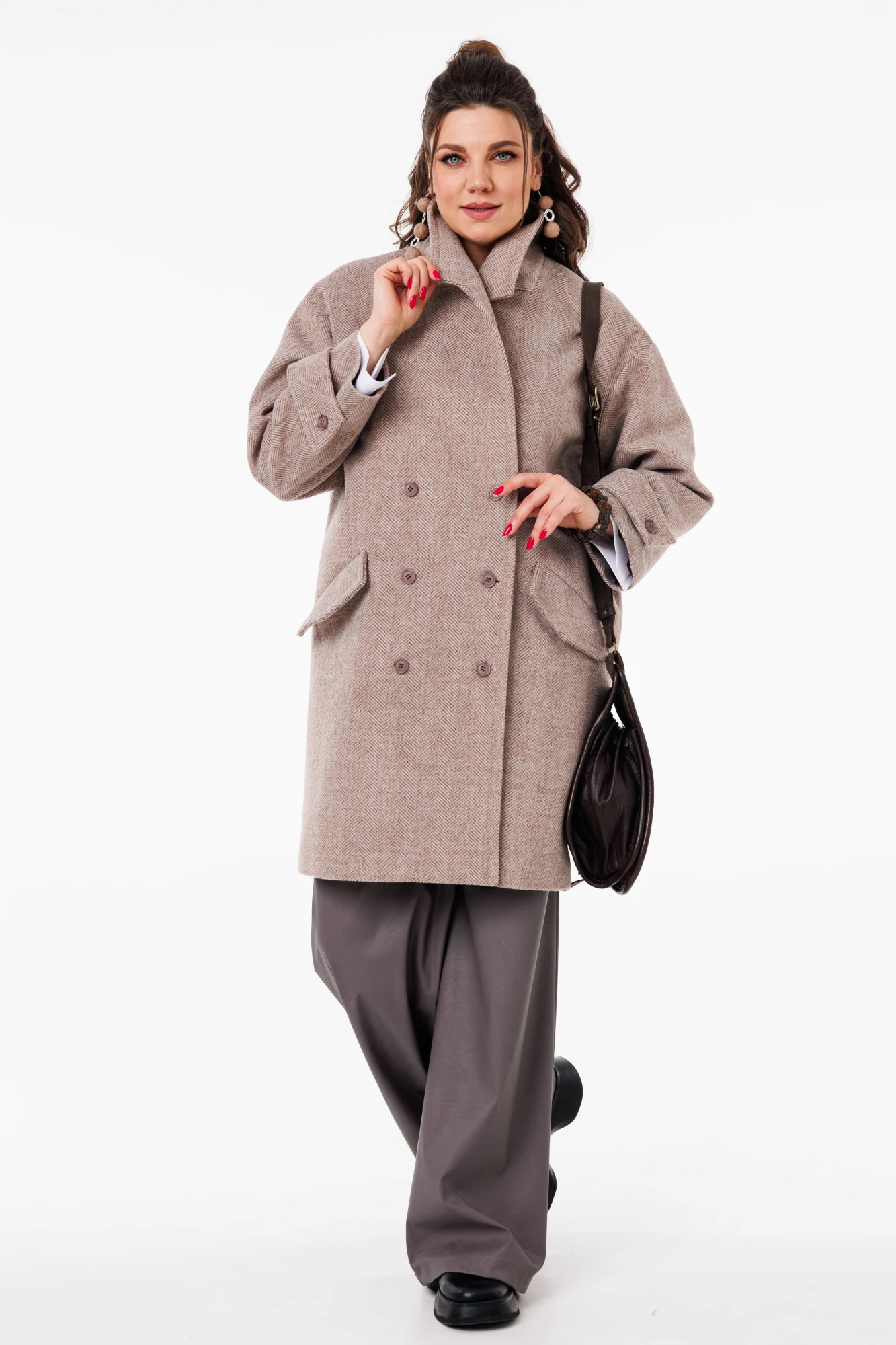 Модель оверсайз со спущенным плечом создана для тех, кто ценит свободу движений и непринужденную элегантность. Двубортный крой придает пальто особый шарм, а паты на рукавах со скосом — изысканную деталь, которая привлекает внимание. Карманы с клапанами добавляют функциональности, сохраняя при этом общий утончённый образ.