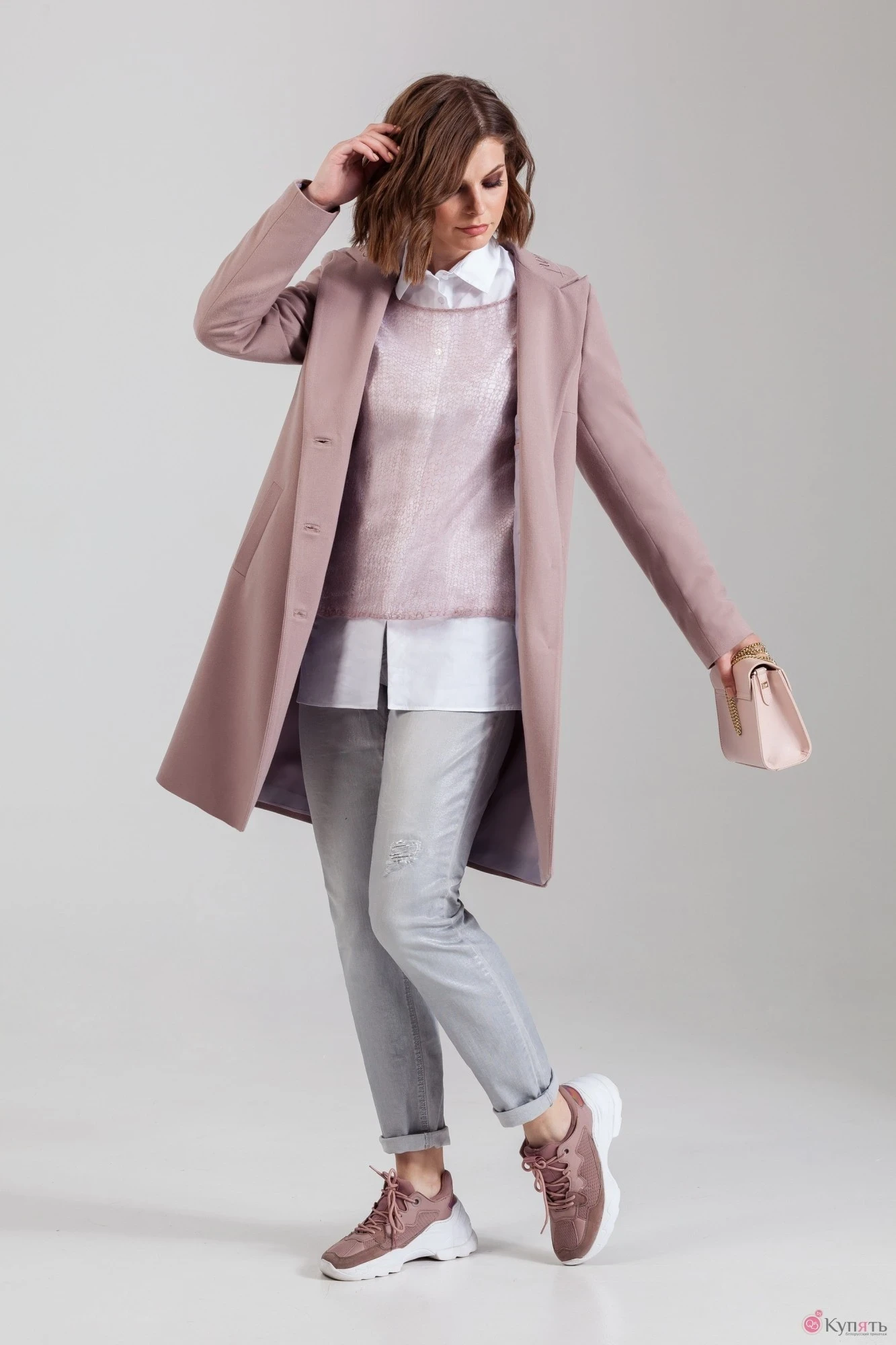 Пальто прямого силуэта на подкладке с воротником и лацканами. На верхнем воротнике вышивка в тон основной ткани. Застежка центральная на петли и пуговицы. Рукав втачной, длинный. На полочке обработаны функциональные карманы-листочки.