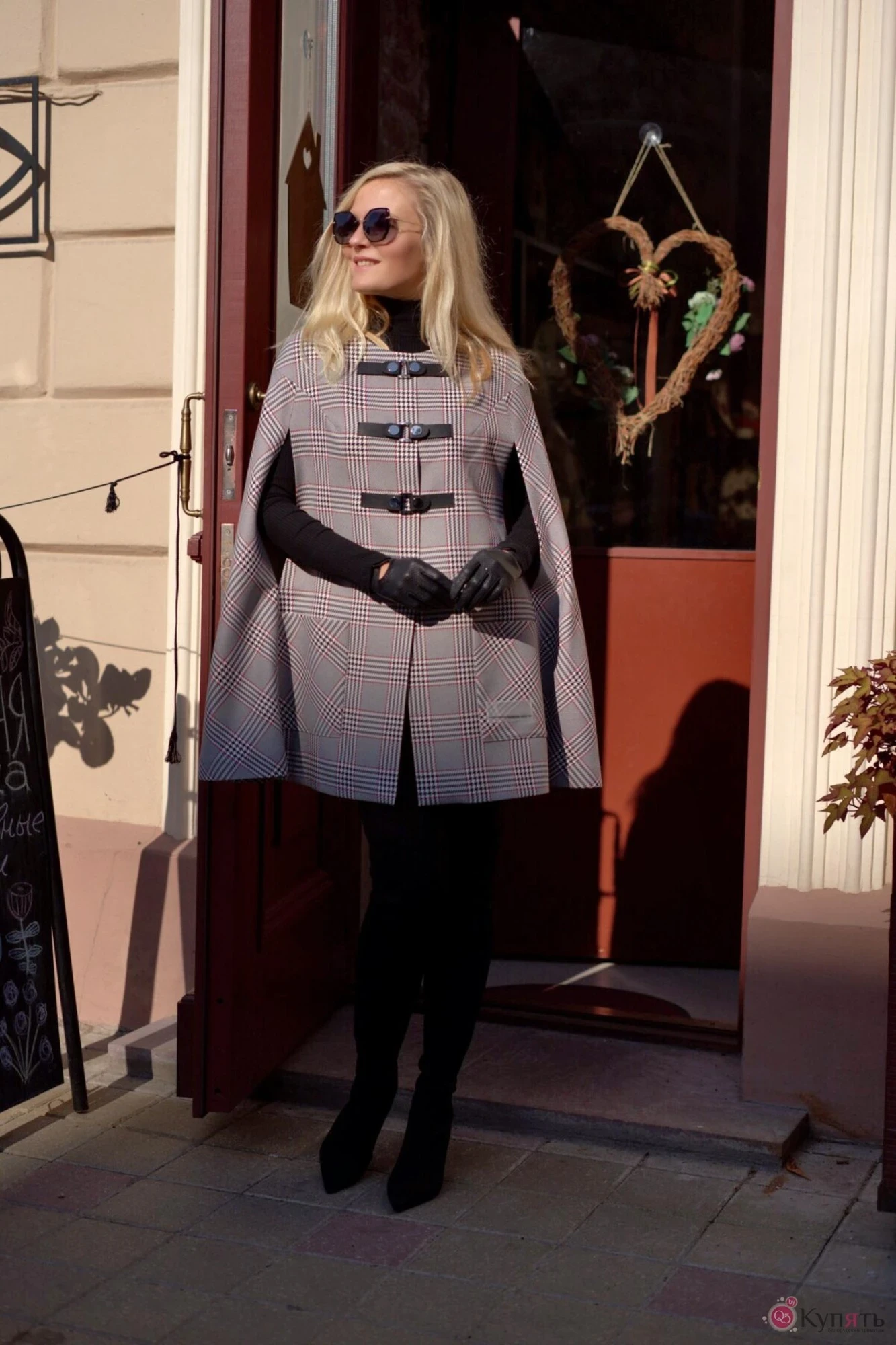 Пальто-кейп женское из ткани в клетку, свободного покроя, вырез горловины круглый, застегивается спереди на пряжки-«клеванте» с кнопками, по переду накладные карманы, разрезы для рук, изделие на подкладке.