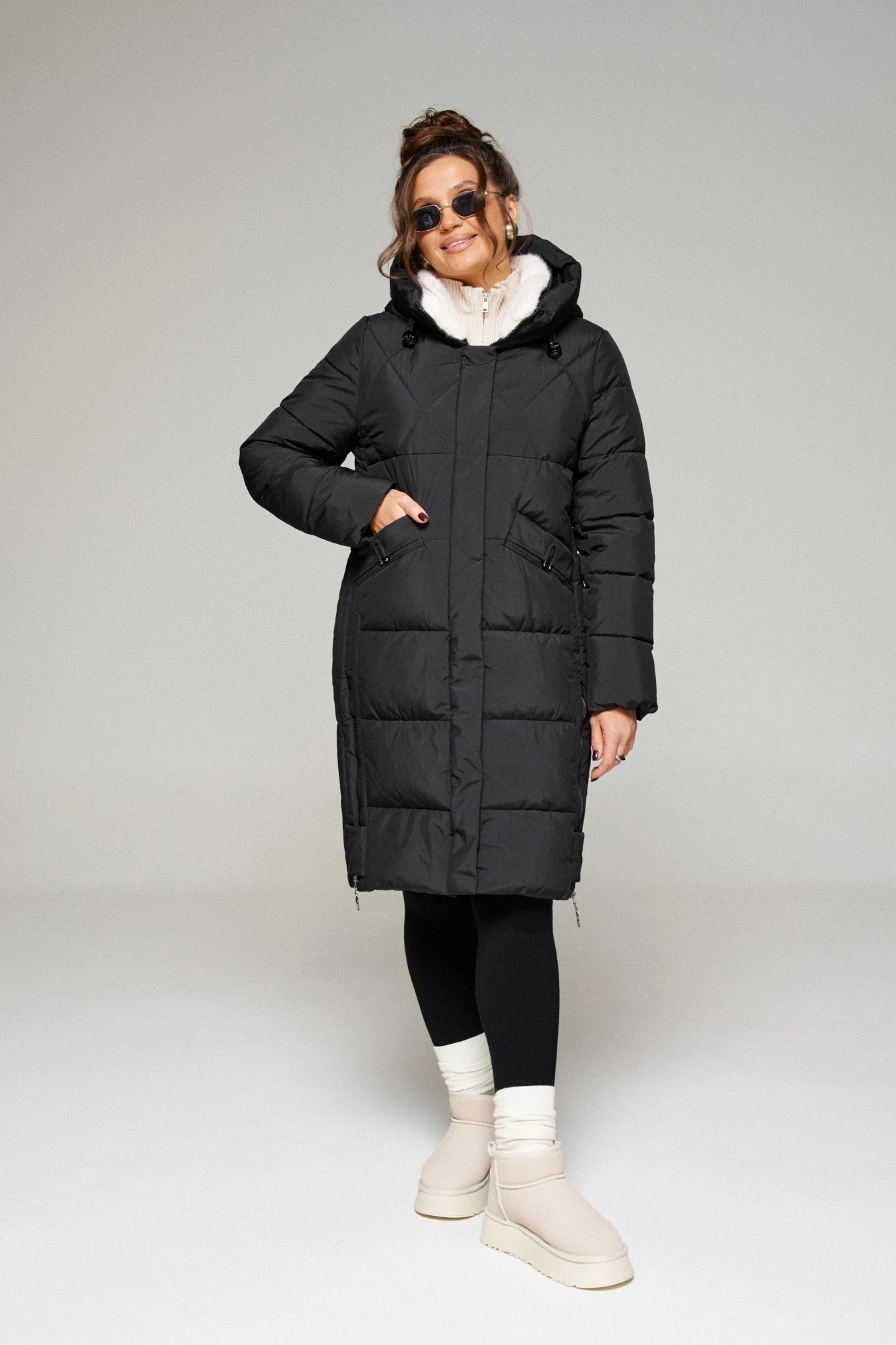 Воротник стойка прилегает к шее и создает удобство при носке. Внутренняя часть воротника выполнена из отделочной ткани: искусственный мех натурального оттенка.