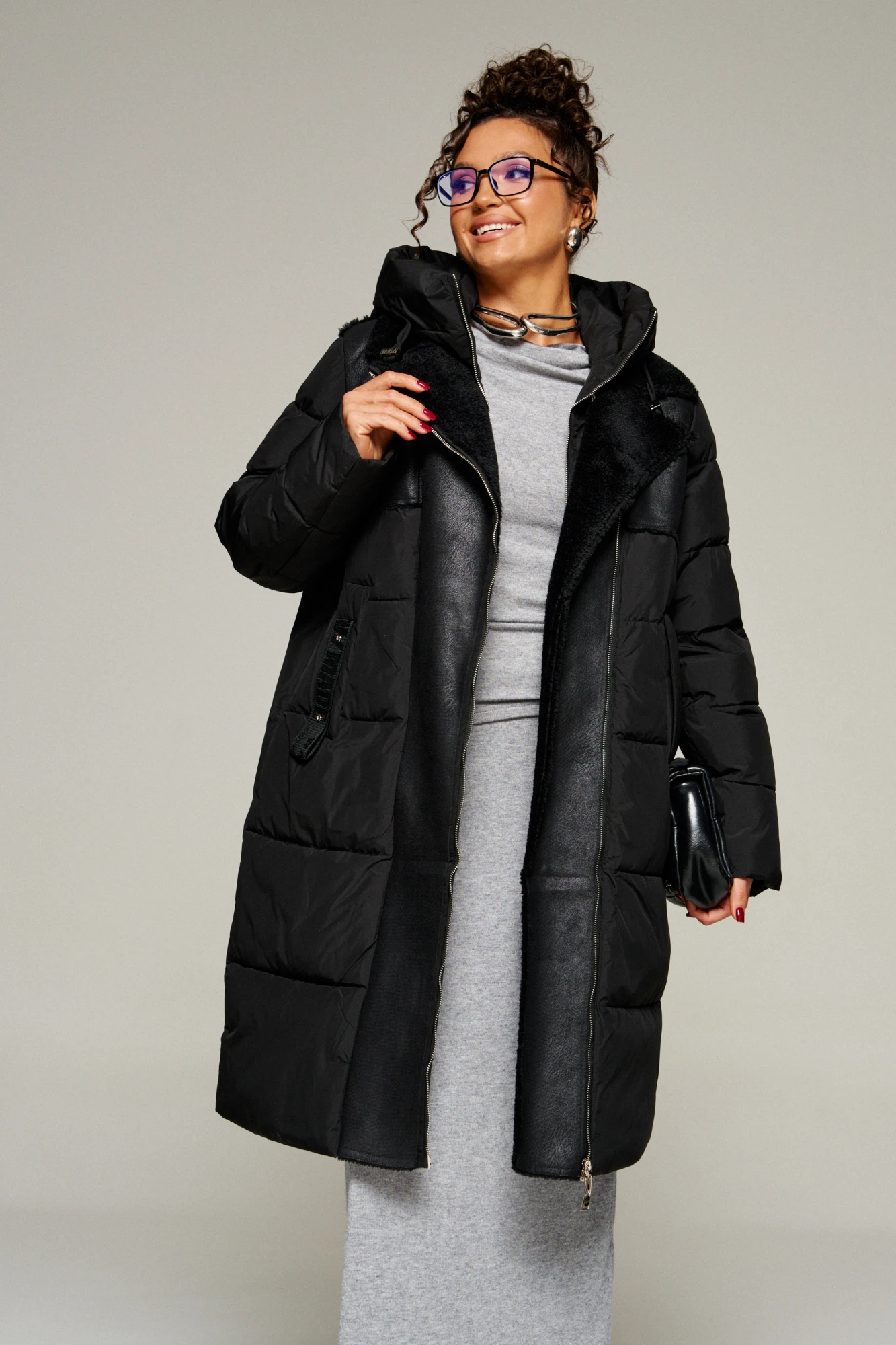 Перед с подрезной кокеткой из экокожи и с симметричными боковыми прорезными карманами с широкой обтачкой, фиксируемые на кнопку. На правом кармане выполнен декоративный элемент в виде широкой репсовой тесьмы. Центральная вставка переда, переходящая в воротник, выполнена из двусторонней экокожи, где внутренняя сторона – искусственный мех «овчина».