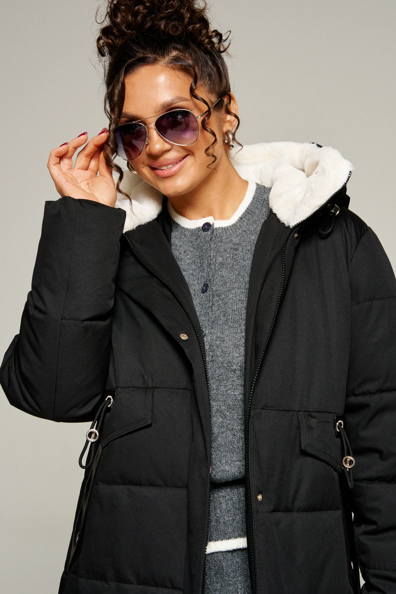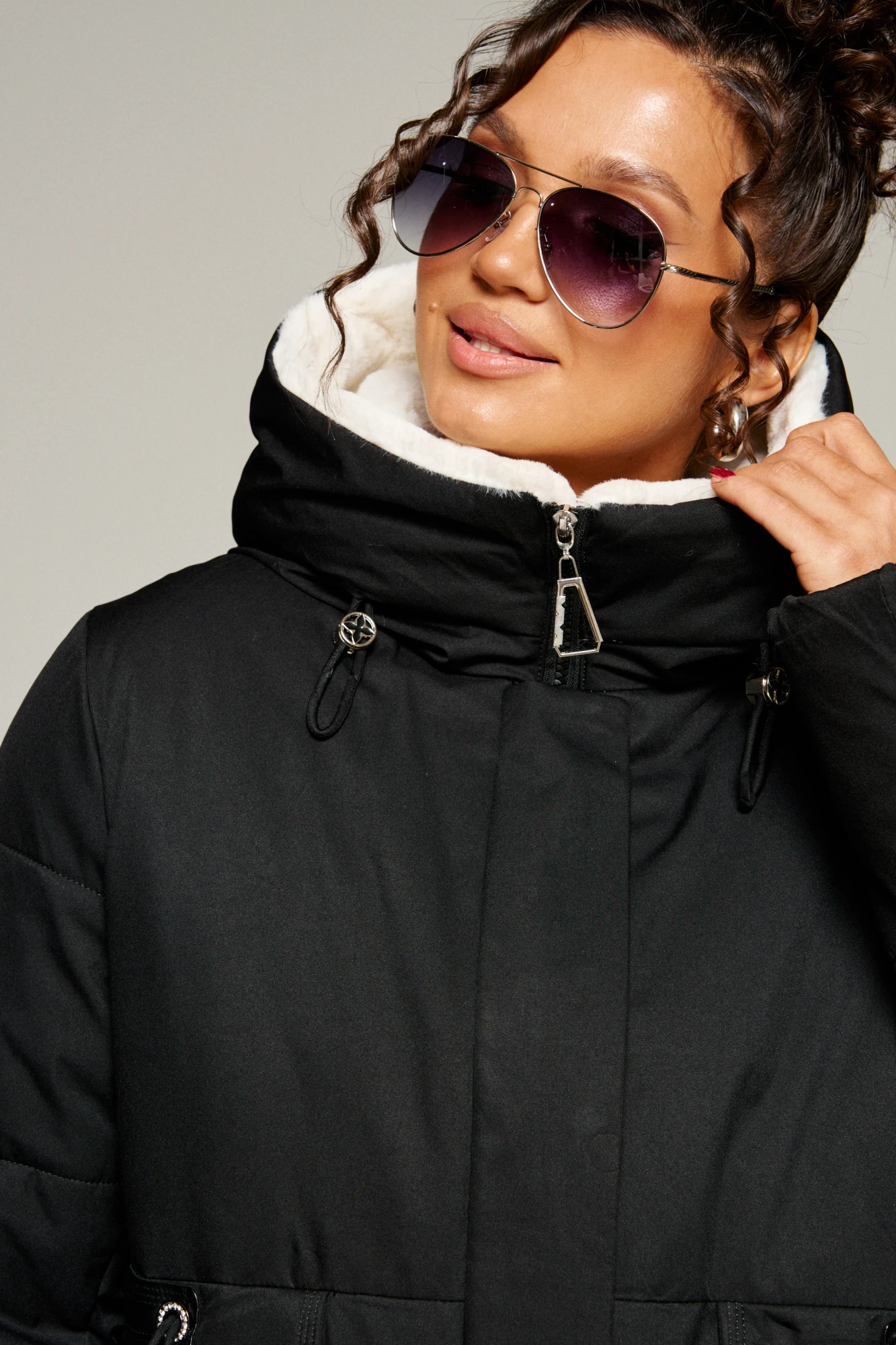 Капюшон с застежкой спереди умеренного объема. Внутренняя часть капюшона выполнена из искусственного меха, который выполняет декоративную и защитную функции, создавая дополнительное тепло и защиту от ветра и холода.