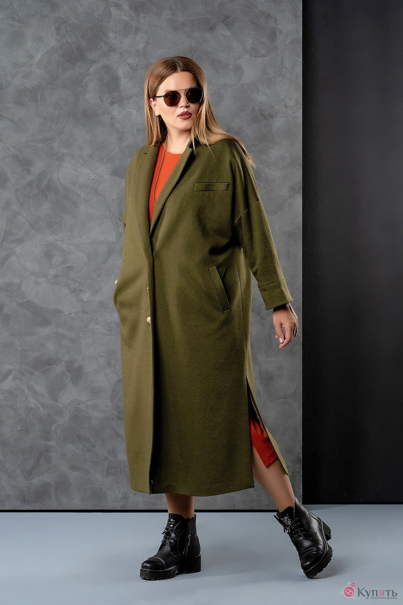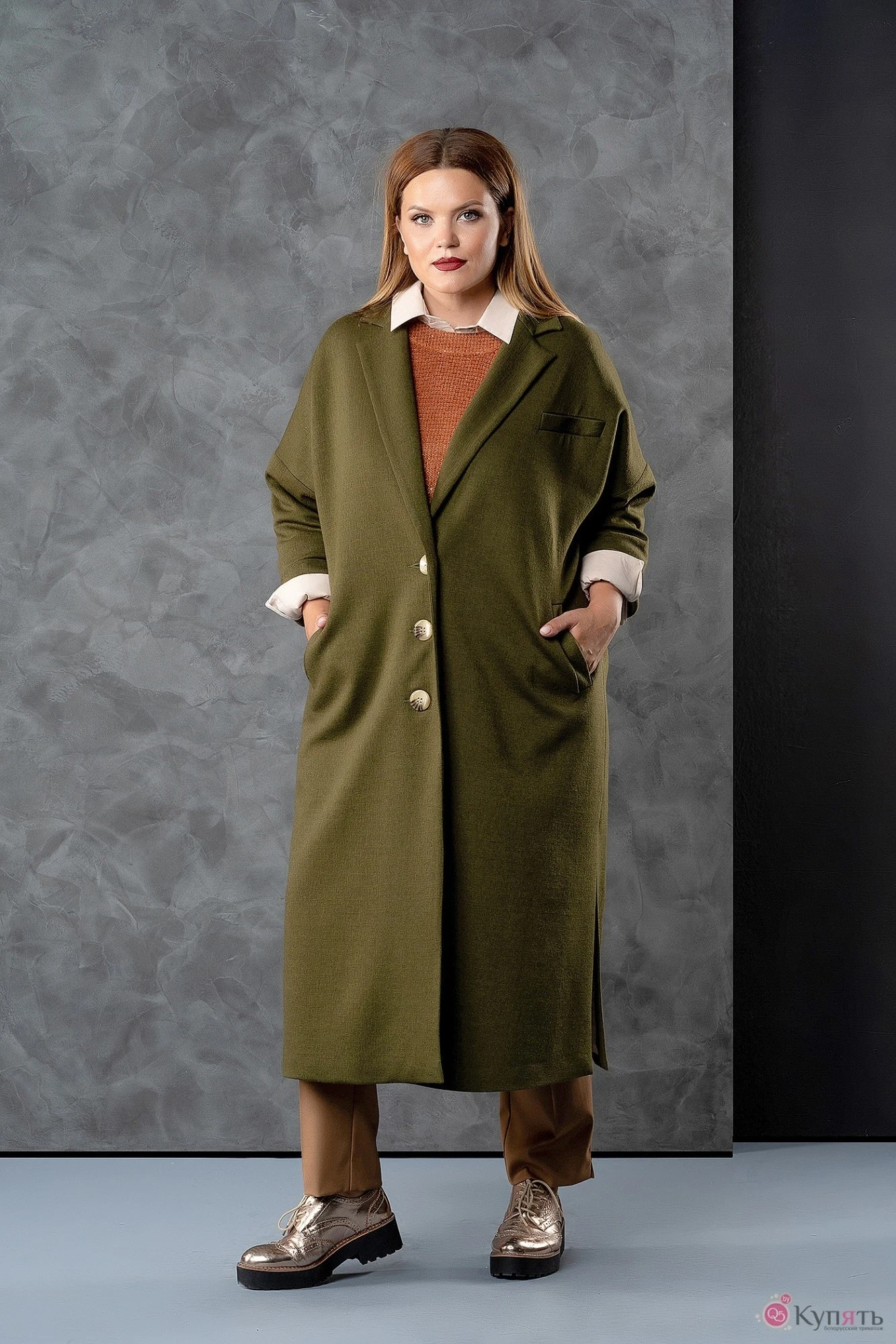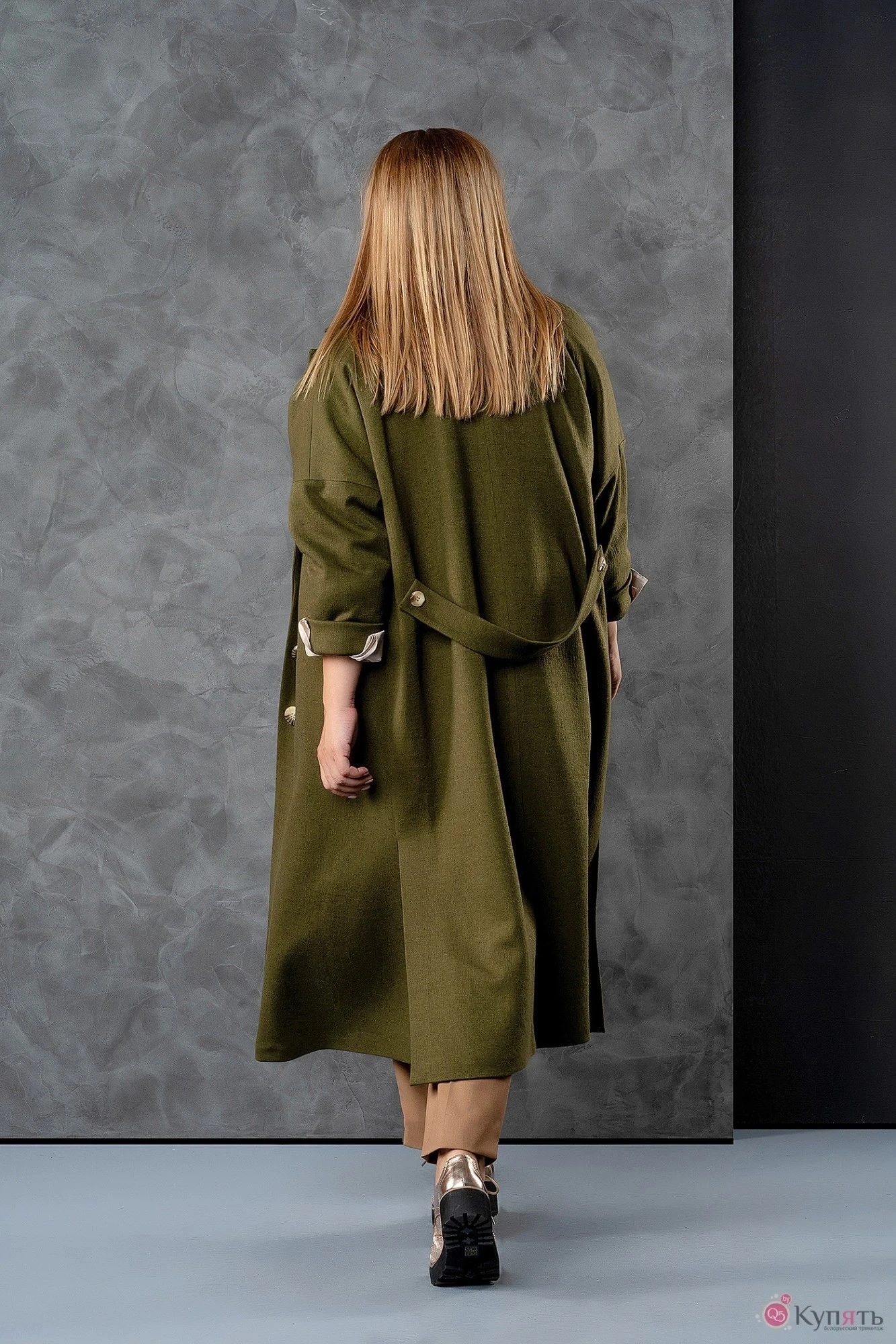 Пальто женское свободного силуэта из мягкой ткани с добавлением шерсти на подкладке. Вырез горловины оформлен воротником пиджачного типа. Застежка- однобортная на петли с пуговицами.Рукава- втачные, со спущенной линией плеча. Низа рукавов оформлены отложными манжетами. На спинке имеется декоративный хлястик с отделочными пуговицами. На полочках выполнены функциональные прорезные карманы с листочками. В боковых швах - высокие разрезы.
