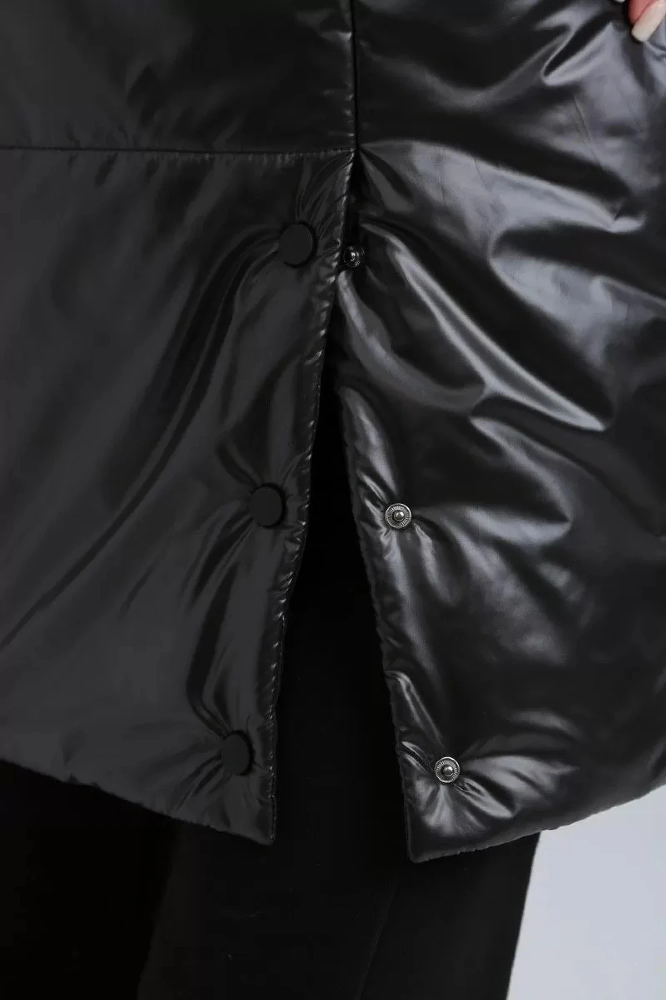 Пальто женское полуприлегающего силуэта, с центральной застежкой на тесьму-молнию и планку (потайные кнопки). Карманы в рельефах с отрезной листочкой (на листочке отделочные кулисы, протянут шнур - резинка с фиксатором) . Спинка с отрезными бочками , по низу рельефов шлицы с застежкой на кнопки. Рукав втачной, одношовный с отделочным манжетом по низу (довяз). Воротник- стойка, нижний воротник из отделочной ткани (довяз). Капюшон объемный (на кнопках) с центральной частью и с отделочной частью по отлету, с застежкой на кнопки. В качестве отделки используется фурнитура и детали.