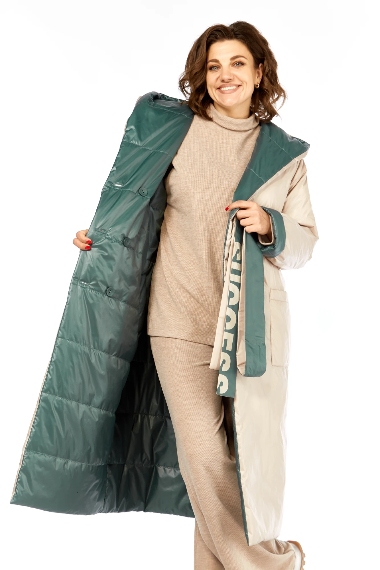 Пальто женское прямого силуэта с двубортной застежкой на 6 пуговиц. Пальто двухстороннее. Светлая сторона выстегана синтепоном. Перед с боковыми прорезными карманами с листочкой на светлой стороне и накладными на темной. Рукава втачной, двухшовный. Воротник-капюшон цельнокроеный с полочкой. Пояс съемный, двухсторонний, по светлой стороне украшен печатью