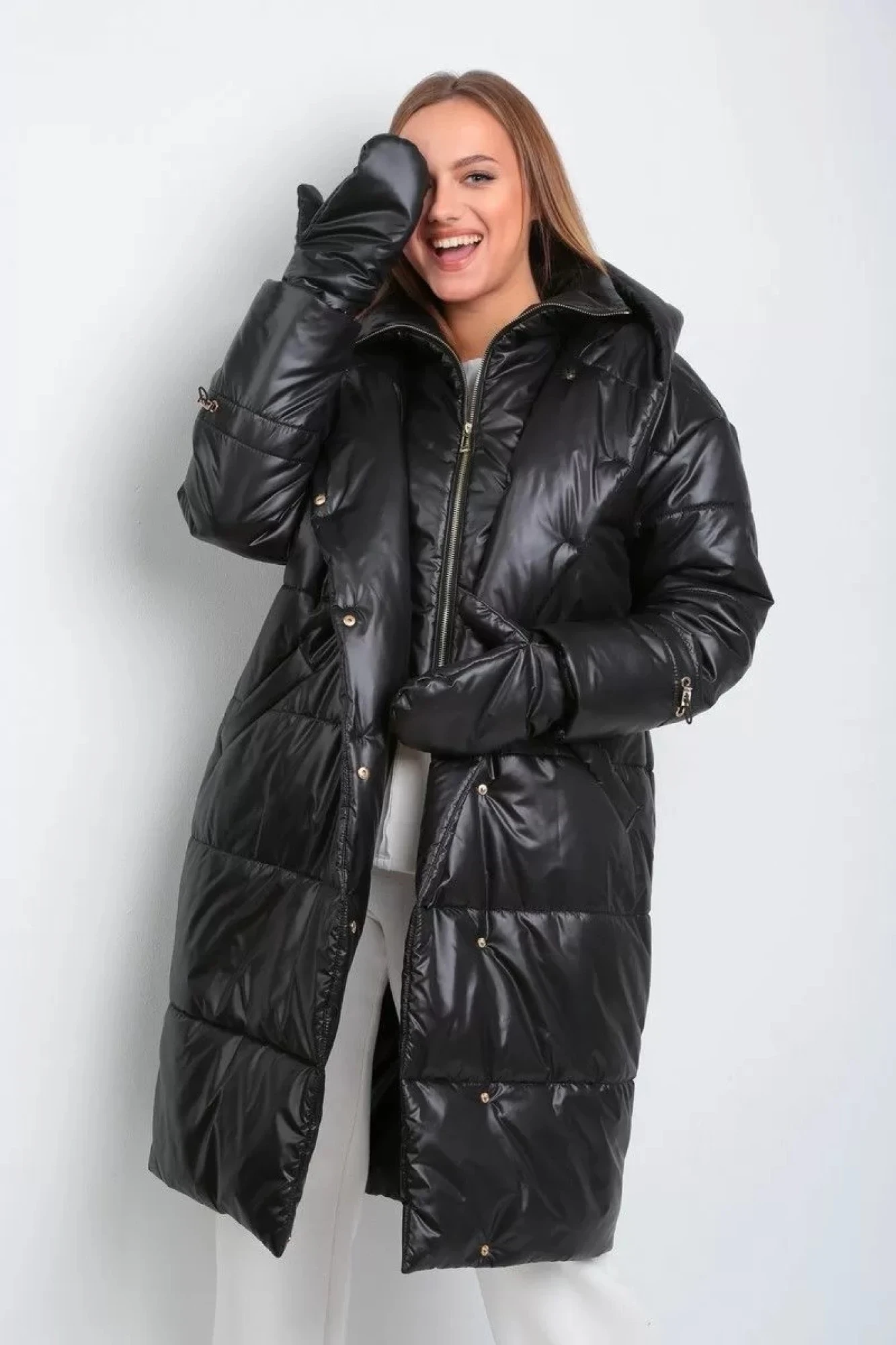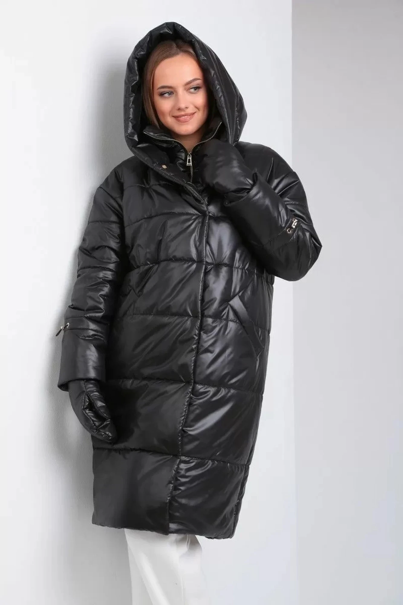 Пальто женское с центральной застёжкой на кнопки. Линия плеча спущенная, рукав втачной одношовный с кулисой по низу. По переду прорезные карманы с листочкой с втачными краями. Капюшон цельнокроенный с центральной частью. В качестве отделки испоьзуются детали. Варежки съёмные манишка с центральной с центральной застёжкой на тесьму-молнию(втачная деталь).