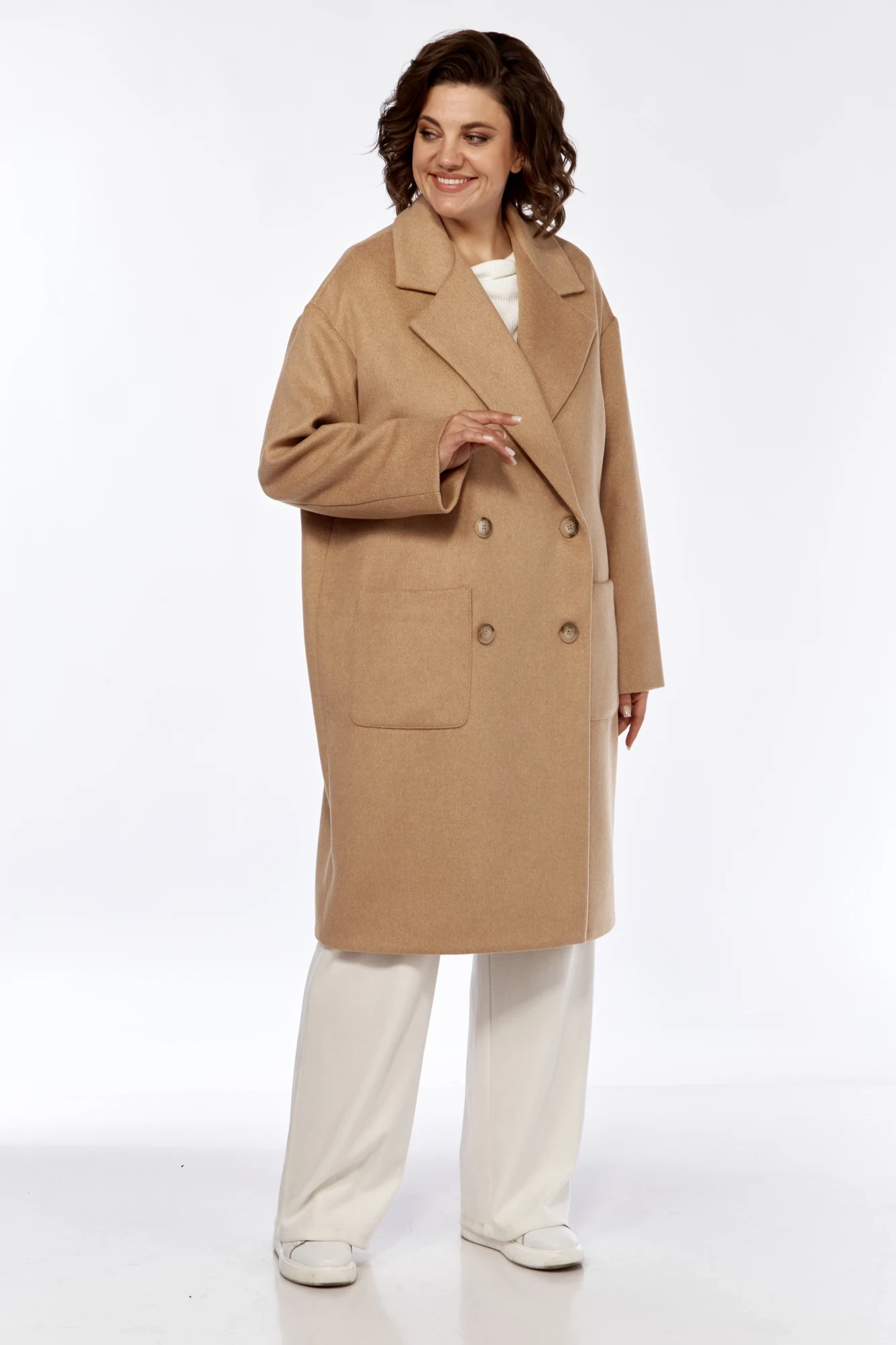 Пальто женское, свободного кроя с двухбортной застежкой на петли ипуговицы, с открытыми бортами,линия плеча спущена. По спинке средний шов, по переду накладные карманы. Рукав втачной 2-шовный. Воротник стояче-отложной.