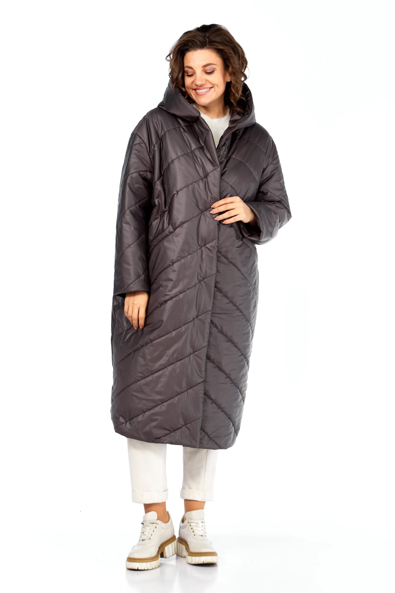 Пальто женское, прямого силуэта со смещенной застежкой на молнию (внутренняя) и кнопки. Линия плеча спущенная, рукав втачной одношовный. По переду карманы с личточкой. По спинке средний шов. Капюшон с центральной частью и отделочной деталью по отлету. В качестве отделки используется фурнитура и детали. Утеплитель- синтепон 150 гр.
