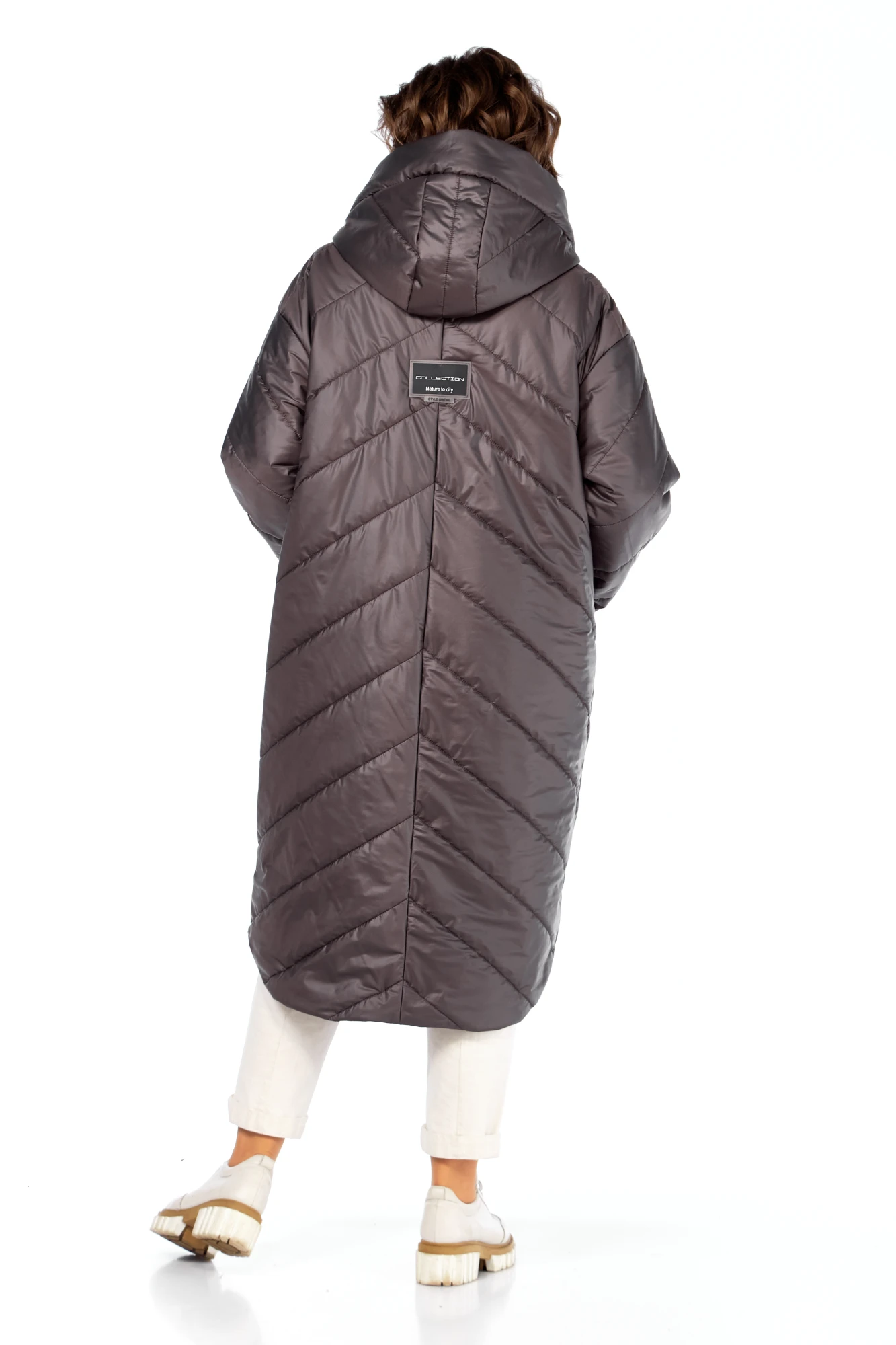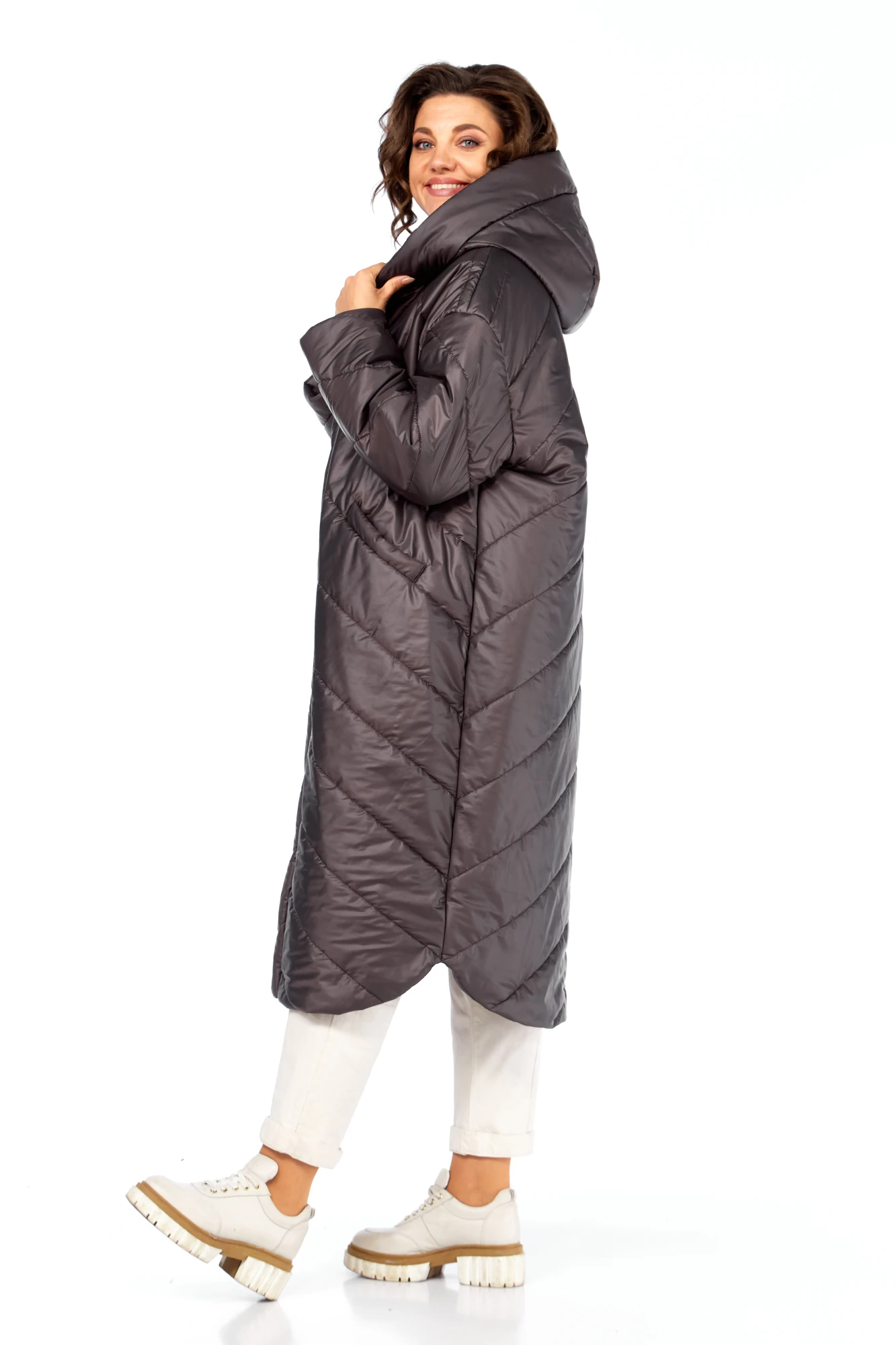 Пальто женское, прямого силуэта со смещенной застежкой на молнию (внутренняя) и кнопки. Линия плеча спущенная, рукав втачной одношовный. По переду карманы с личточкой. По спинке средний шов. Капюшон с центральной частью и отделочной деталью по отлету. В качестве отделки используется фурнитура и детали. Утеплитель- синтепон 150 гр.