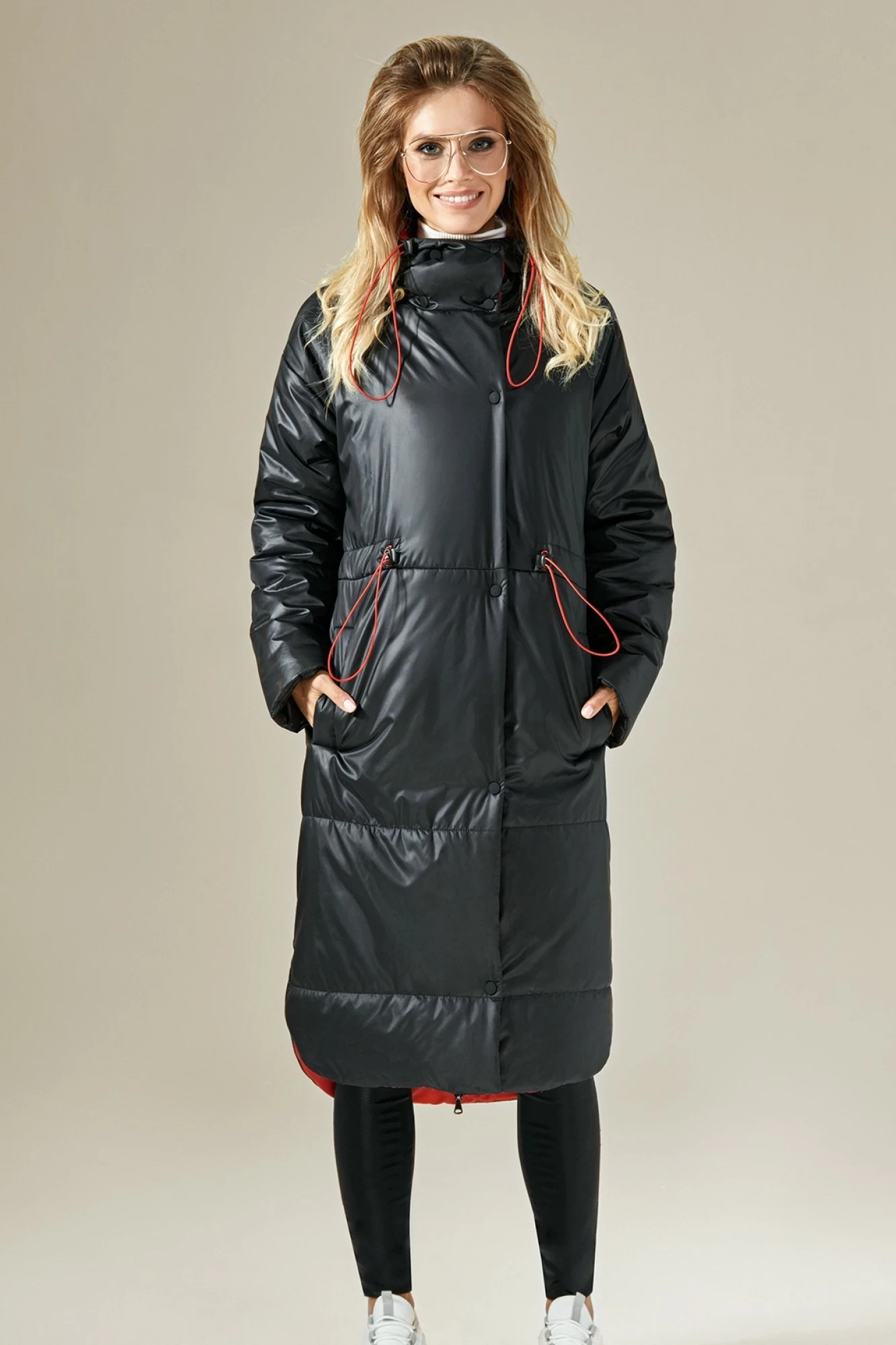 ПАЛЬТО ЖЕНСКОЕ УТЕПЛЕННОЕ ПРЯМОГО СИЛУЭТА С КАПЮШОНОМ, С ЦЕНТРАЛЬНОЙ БОРТОВОЙ ЗАСТЕЖКОЙ НА МЕТАЛЛИЧЕСКУЮ РАЗЪЕМНУЮ ТЕСЬМУ-МОЛНИЮ И КНОПКИ. ПАЛЬТО ОТРЕЗНОЕ ПО ЛИНИИ ТАЛИИ. ПО НИЖНЕЙ ЧАСТИ ПЕРЕДА В ОБЛАСТИ ЛИНИИ БЕДЕР РАСПОЛОЖЕНЫ КАРМАНЫ С ЛИСТОЧКАМИ. РУКАВ ВТАЧНОЙ, ТИПА "ЛЕТУЧАЯ МЫШЬ". ПО НИЖНЕЙ ЧАСТИ ПАЛЬТО И ПО ВЕРХНЕЙ ЧАСТИ СПИНКИ ПРОЛОЖЕНЫ ГОРИЗОНТАЛЬНЫЕ ОТДЕЛОЧНЫЕ СТРОЧКИ, ФИКСИРУЮЩИЕ УТЕПЛИТЕЛЬ. ПО ЛИНИИ ТАЛИИ ОБРАБОТАНА КУЛИСА С ПРОТЯЖКОЙ ИЗ ЭЛАСТИЧНОГО ШНУРА КОНТРАСТНОГО ЦВЕТА И ФИКСАТОРАМИ ПО ПЕРЕДУ И СПИНКЕ ПАЛЬТО. НИЖНИЙ СРЕЗ ПАЛЬТО ЗАКРУГЛЕННОЙ ФОРМЫ. СПИНКА УДЛИНЕННАЯ. ВНУТРЕННЯЯ ЧАСТЬ КАПЮШОНА И ОБТАЧКА НИЖНЕГО СРЕЗА ПАЛЬТО ВЫПОЛНЕНЫ ИЗ ТКАНИ КОНТРАСТНОГО ЦВЕТА. УТЕПЛИТЕЛЬ - БЕЛЬГИЙСКИЙ ИЗОСОФТ 200. ПОДКЛАДОЧНАЯ ТКАНЬ ЧЕРНОГО ЦВЕТА.