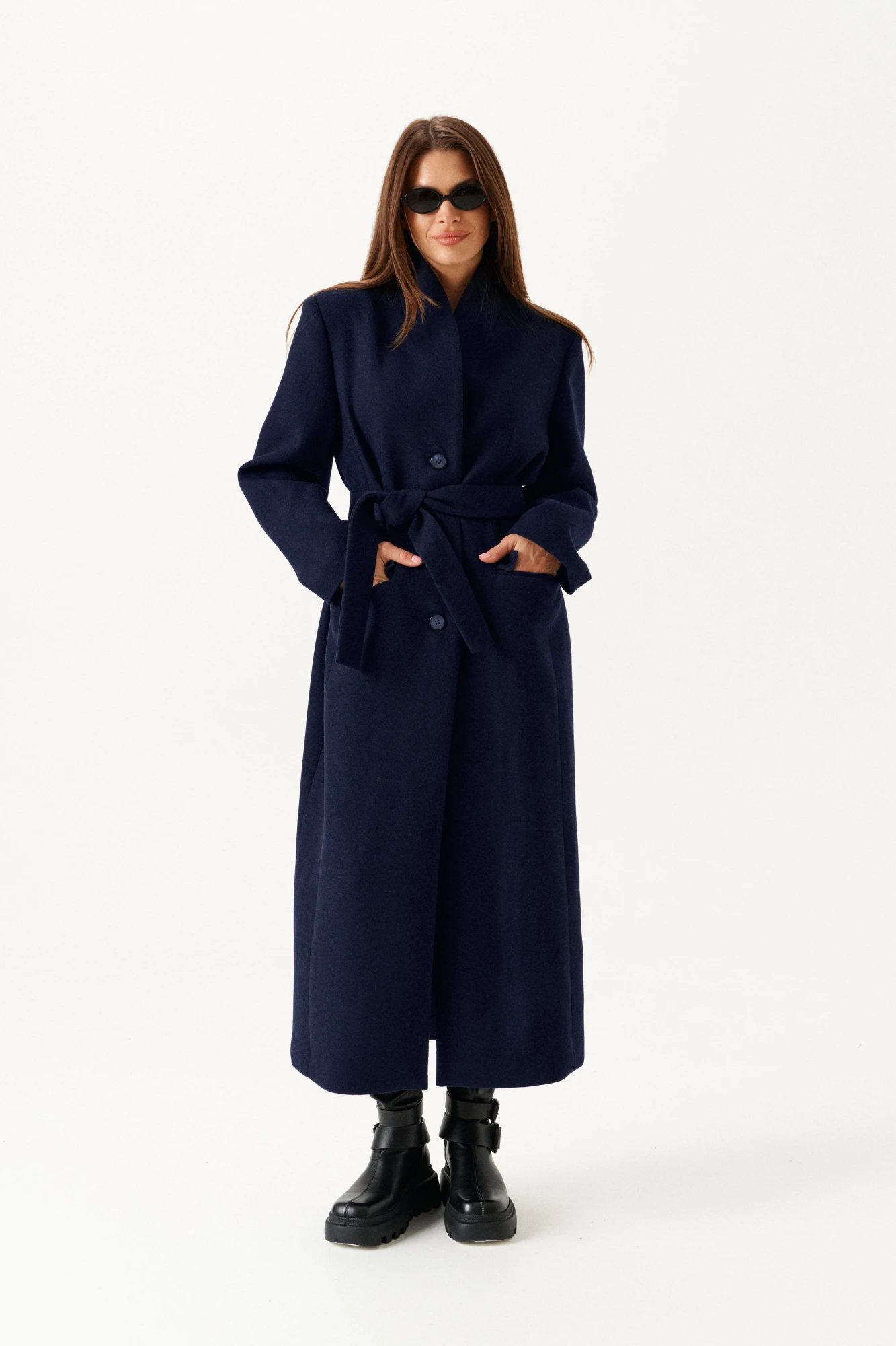 Пальто из пальтовой ткани, прямого силуэта, свободное, с центральной застежкой на петли и пуговицы, на подкладке. Воротник – цельнокроеная стойка. Полочки с отрезными бочками и прорезными карманами с клапаном и двумя обтачками. Спинка с отрезными бочками, со средним швом и шлицей. Рукав втачной, двухшовный, длинный. В комплекте пояс из основной ткани.