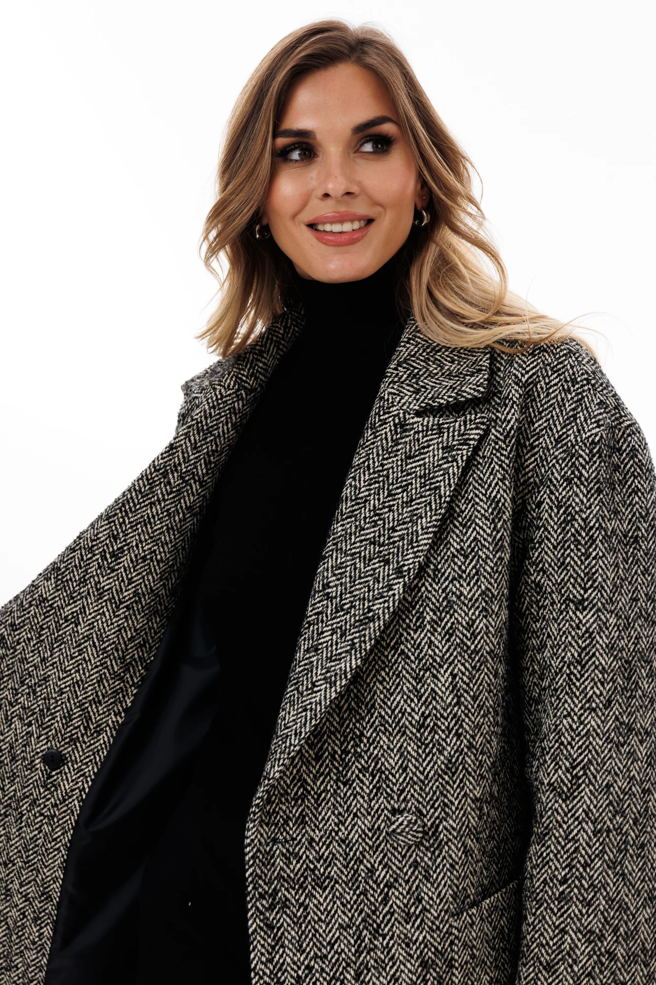 Полупальто выполнено из пальтовой ткани, меланж с рисунком "елочка". Спереди накладные карманы, двубортная застежка. На спинке средний шов. Воротник пиджачного типа. Плечевой шов удлинен. Рукав рубашечного покроя, одношовный с локтевой вытачкой. Полупальто на притачной по низу подкладке.