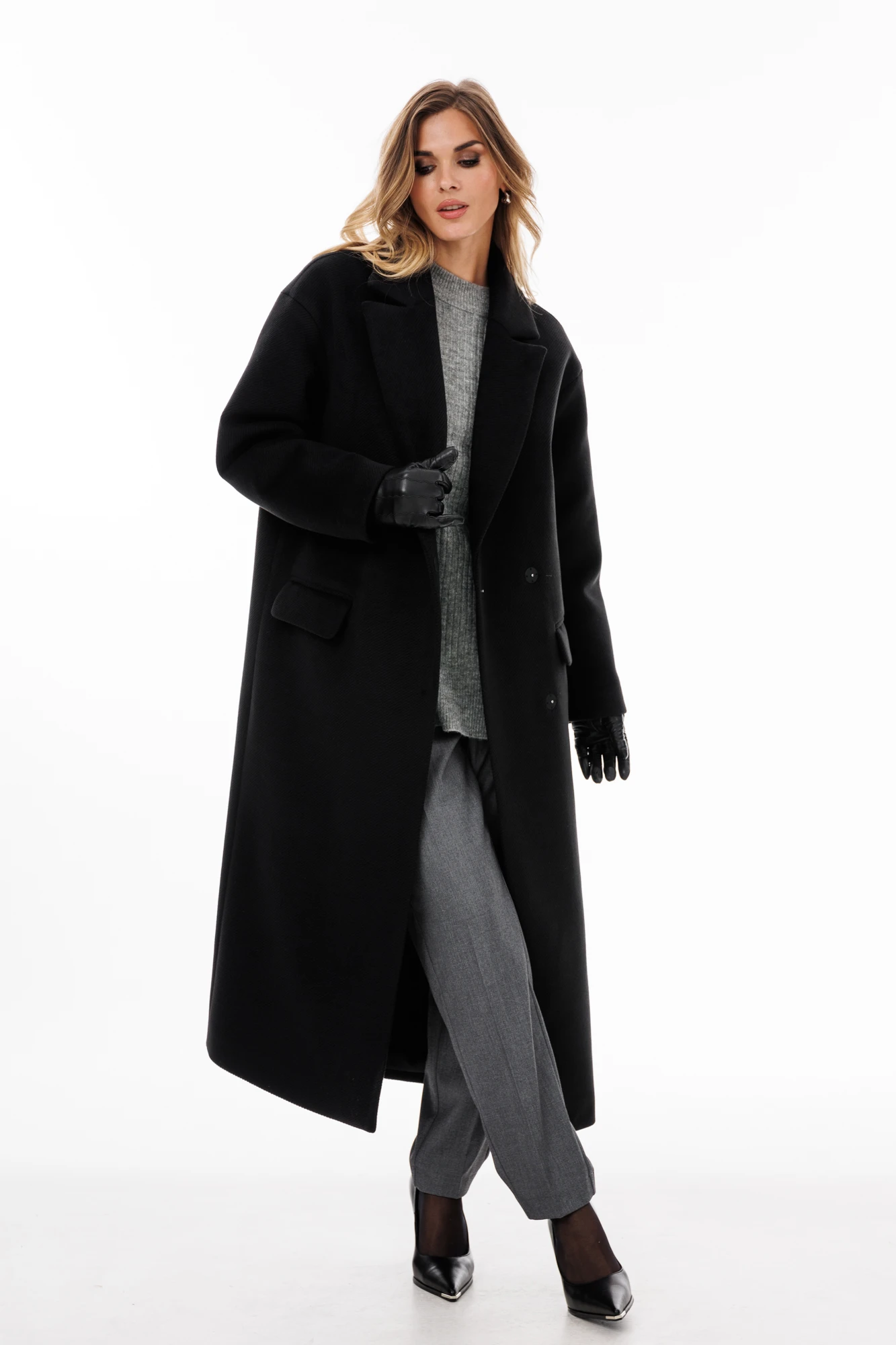 Пальто выполнено из пальтовой ткани в рубчик. Пальто прямого силуэта, длиной до середины икры. Спереди застежка двубортная на пришивные кнопки, горизонтальные прорезные карманы. Спинка со средним швом со шлицей по низу. Воротник пиджачного типа. Плечевой шов спущен. Рукав одношовный. Пальто на притачной по низу подкладке.